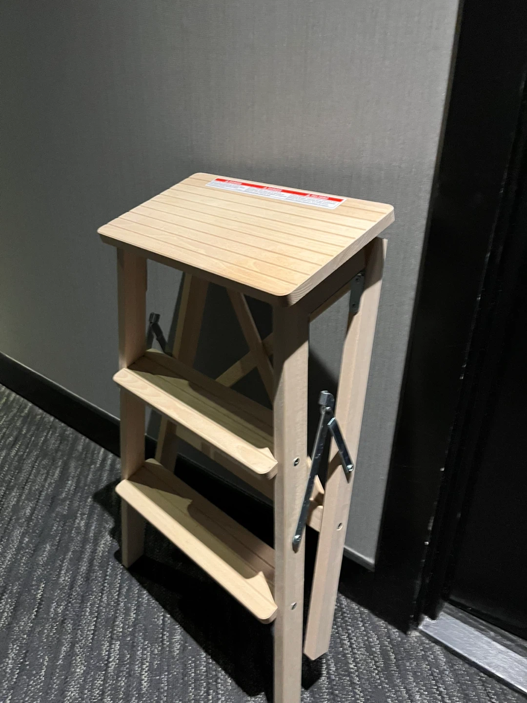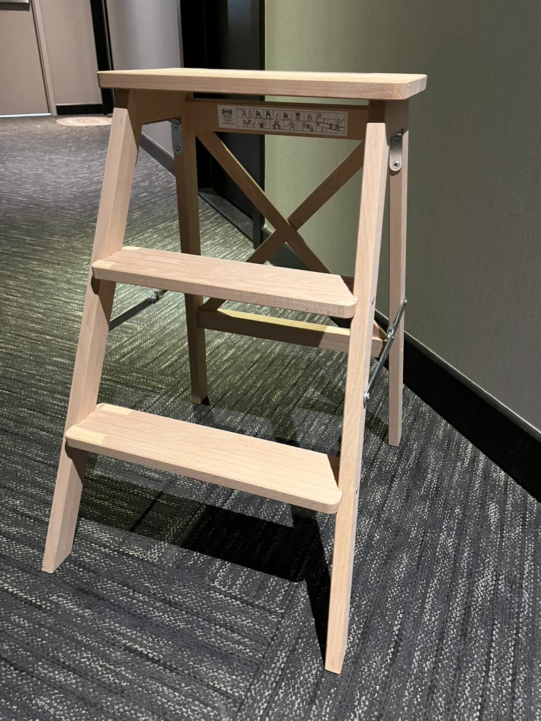 This is a sturdy 3-step wooden step stool. It's made from light-coloured wood and folds for easy storage. Perfect for reaching higher shelves in your kitchen or closet!