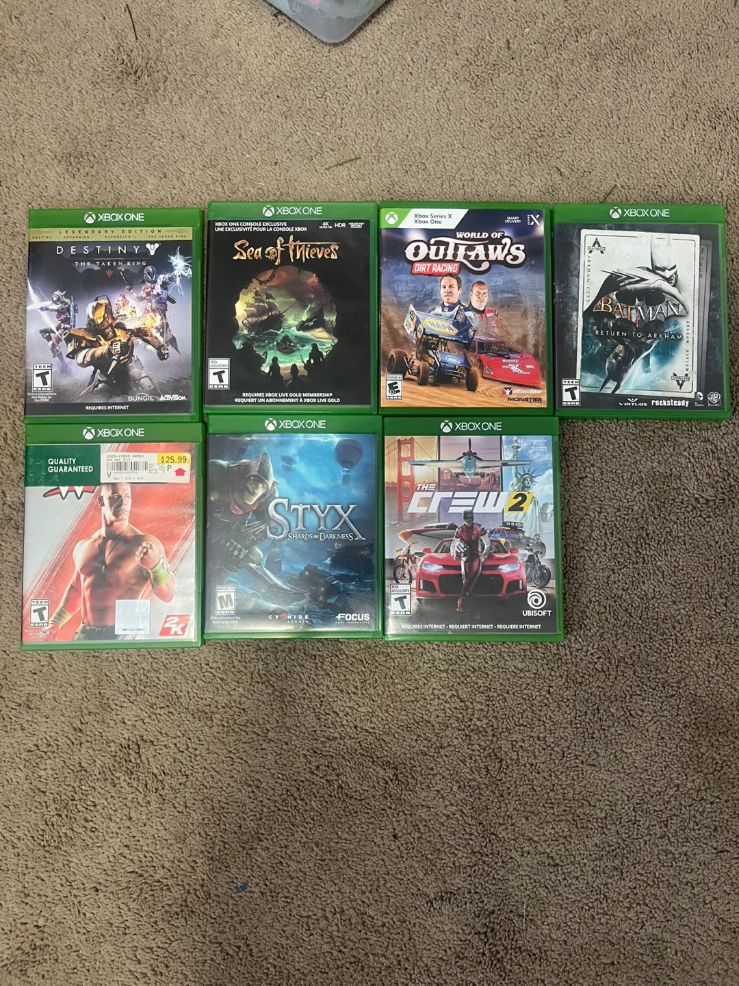 Bundle of 7 Xbox One games including Destiny, Sea of Thieves, World of Outlaws, Batman: Return to Arkham, WWE 2K17, Styx: Shards of Darkness, and The Crew 2. These are physical game discs for the Xbox One console.