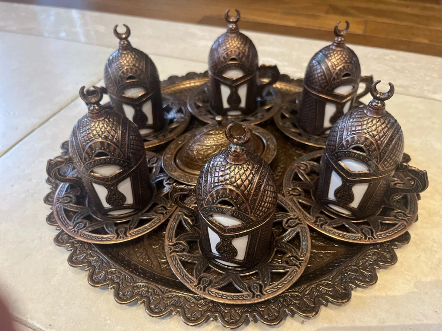 Selling a beautiful Turkish coffee set by Platin Turke. This set includes six cups with lids and saucers, as well as a serving dish with a lid. The intricate designs and detailed craftsmanship make this set a unique addition to any home