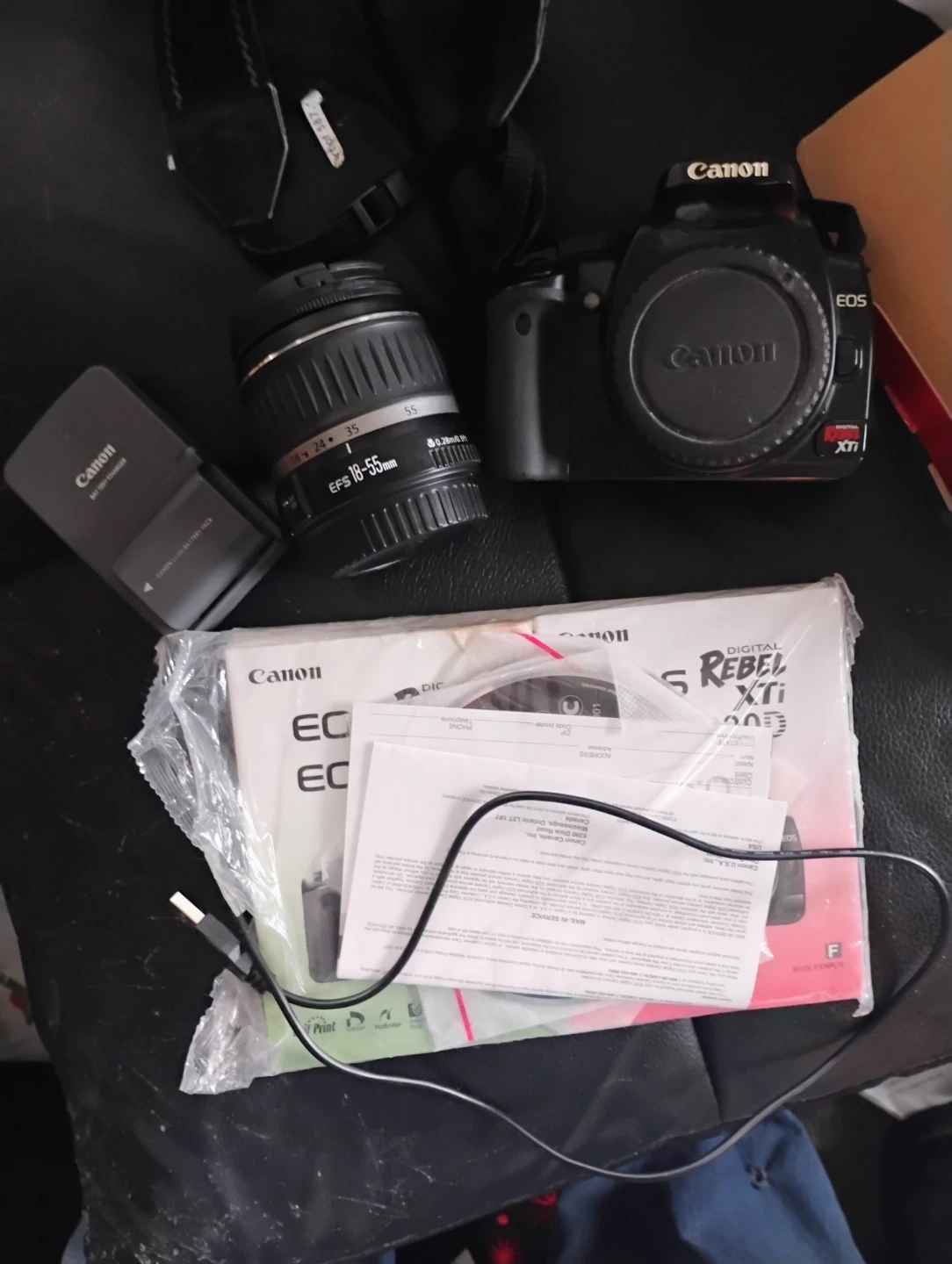 Selling a Canon EOS Rebel XTi digital camera with a 18-55mm lens. This kit includes the camera body, lens, battery charger, and USB cable. It comes with original manuals and documentation & in box