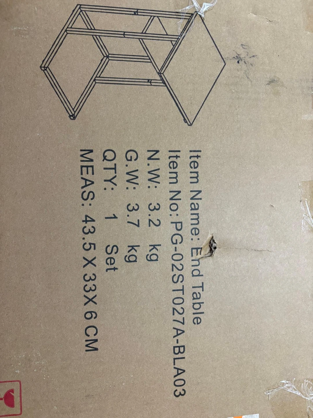 This is an end table.It has a black wood grain finish. Assembly hardware is included in a bag. The item's box indicates measurements of 43.5 X 33 X 6 CM.