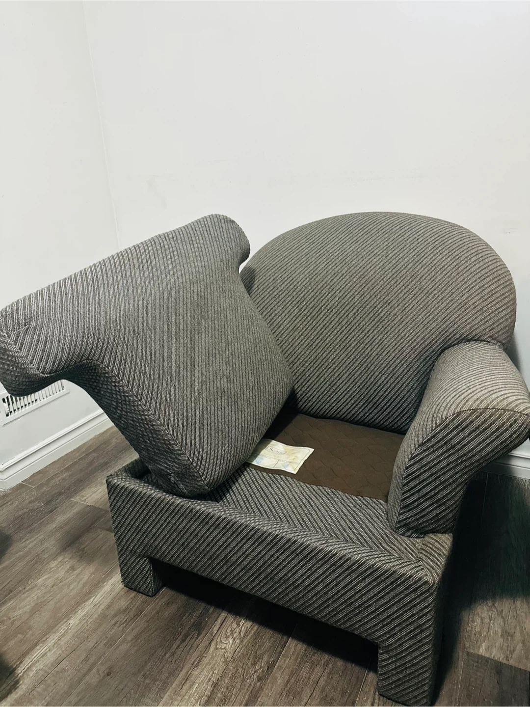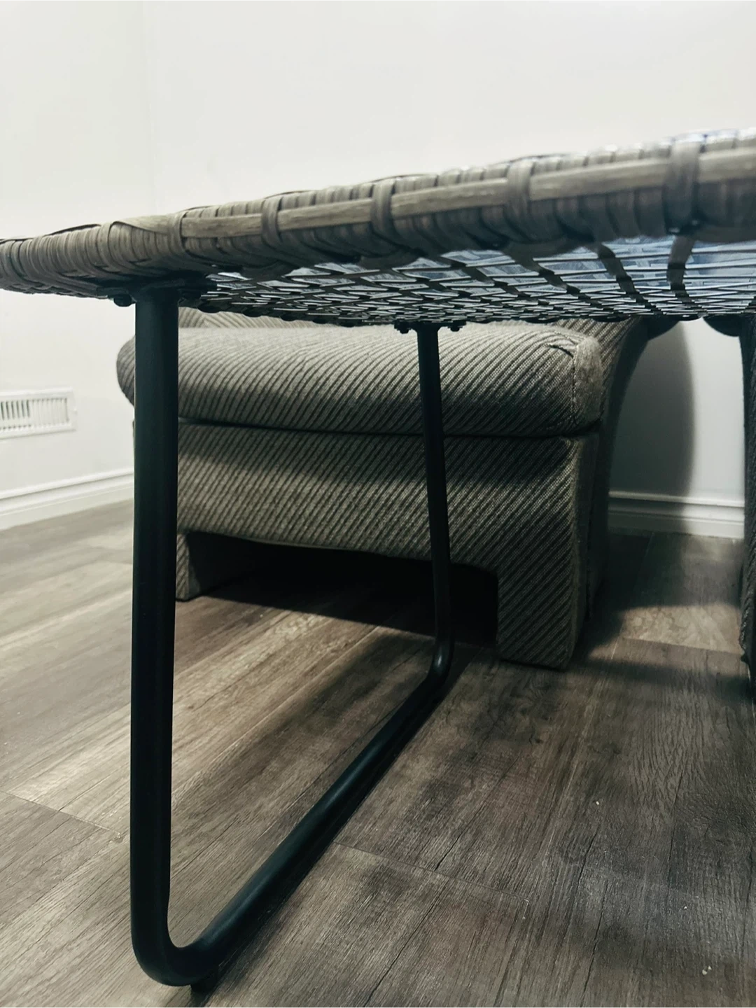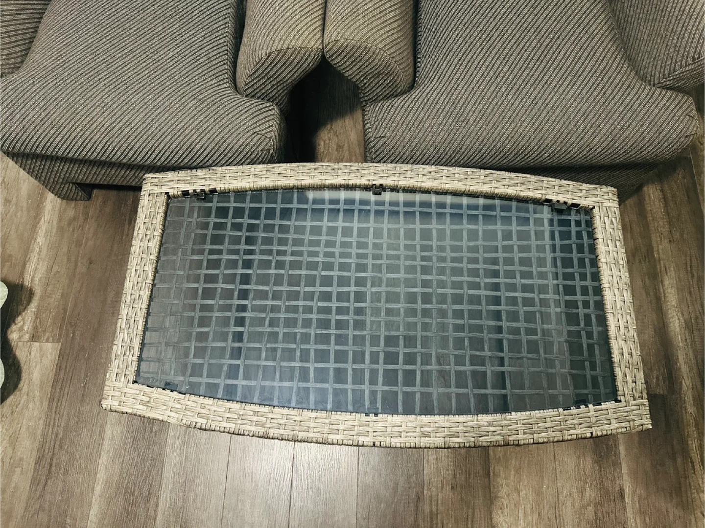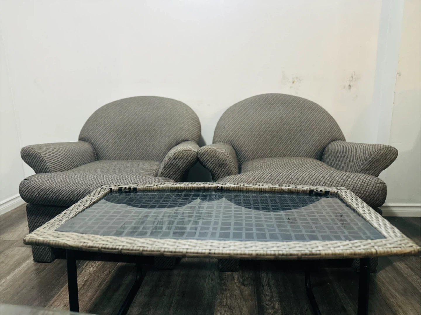 Selling a set of two armchairs and a coffee table. The armchairs are a neutral grey colour with a striped pattern. The coffee table has a glass top and a woven base. They're in good condition and would be a great addition to any living room.