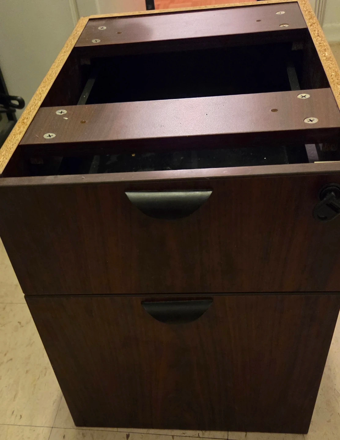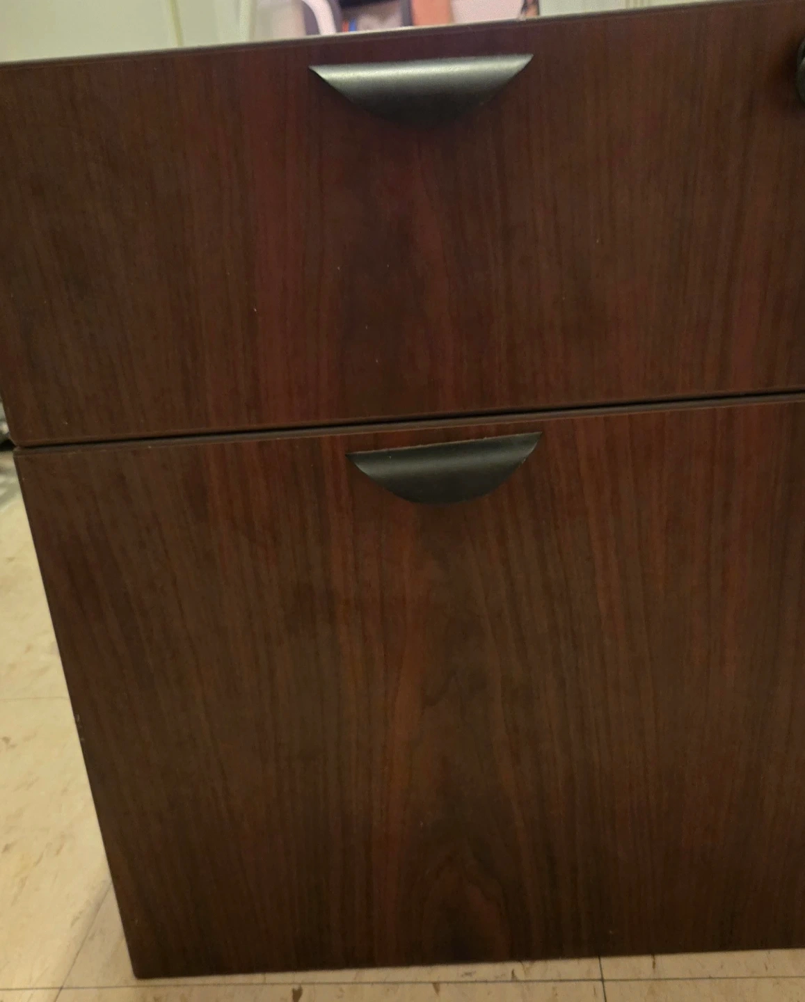 This is a two-drawer filing cabinet with dark wood finish. It has modern black handles and is perfect for organizing office documents. It is under desk cabinet, used minor scratches
