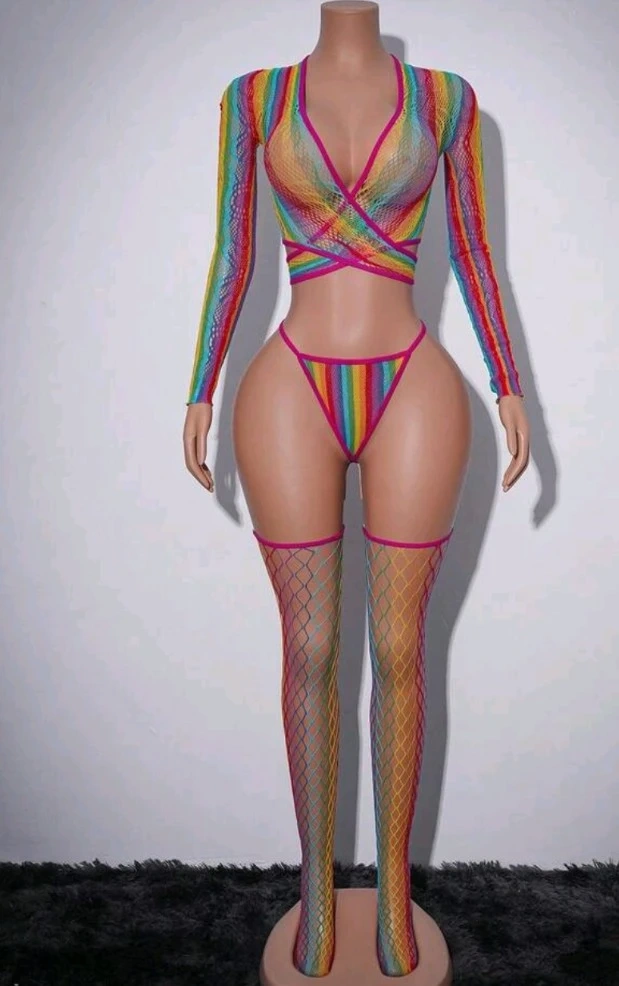 Colorful mesh lingerie set featuring a long-sleeved wrap top and matching thong. Includes fishnet stockings with rainbow stripes. Stretchy, sheer material. I have 260 of them I am selling them each one