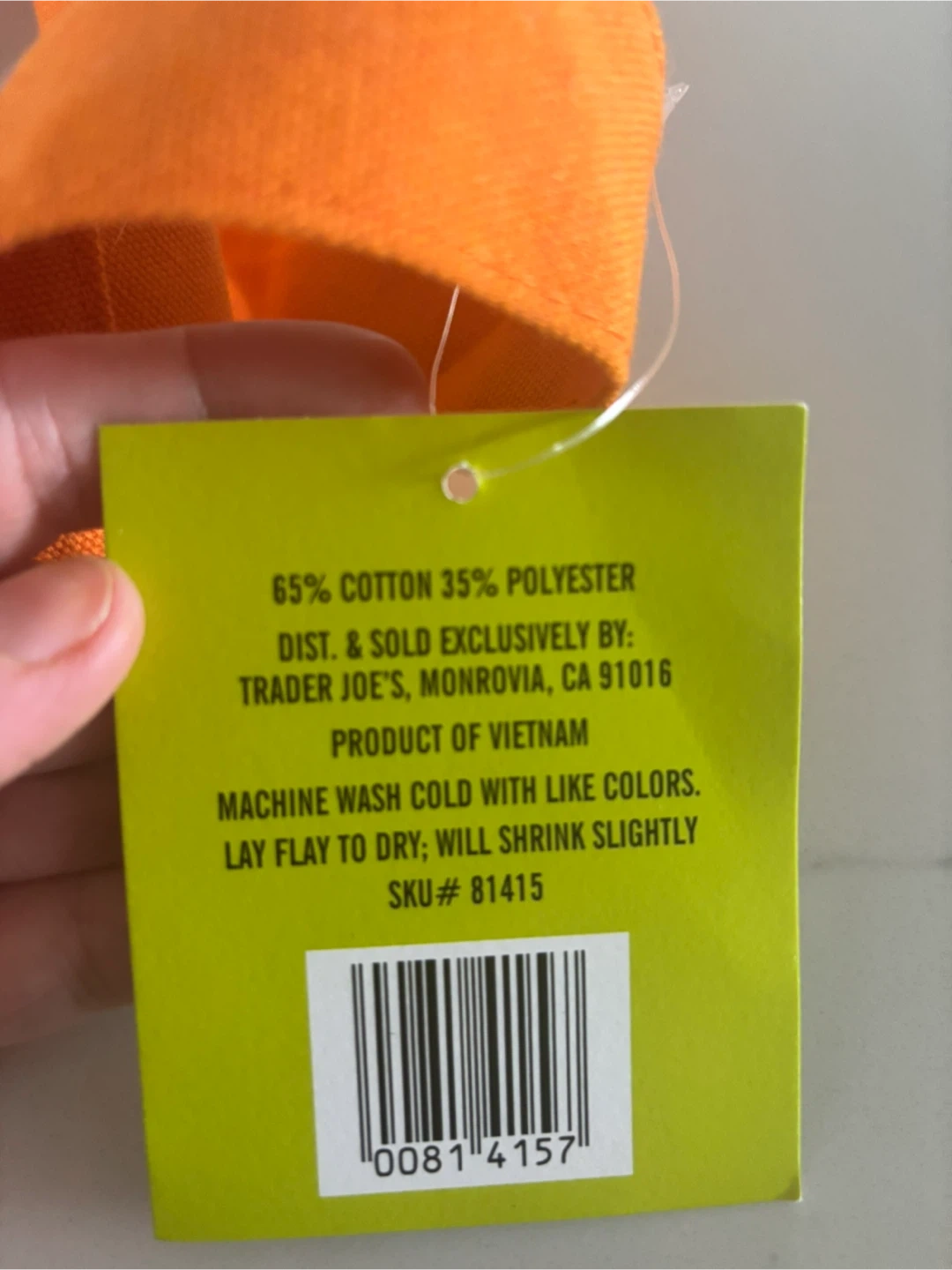 Orange canvas tote bag with Trader Joe's logo. Made of 65% cotton and 35% polyester. Machine wash cold with like colors; lay flat to dry. It'll shrink slightly if dried. Perfect for carrying treats!