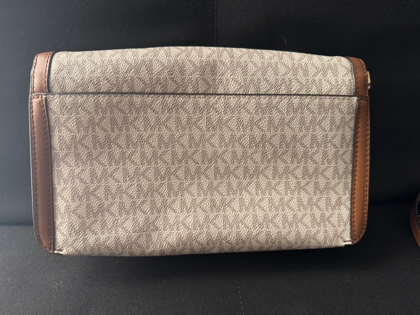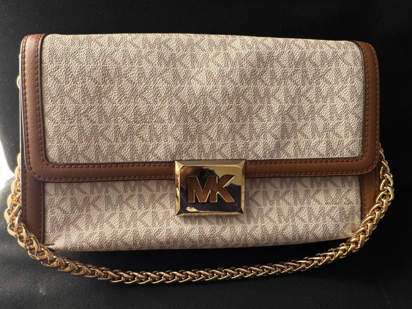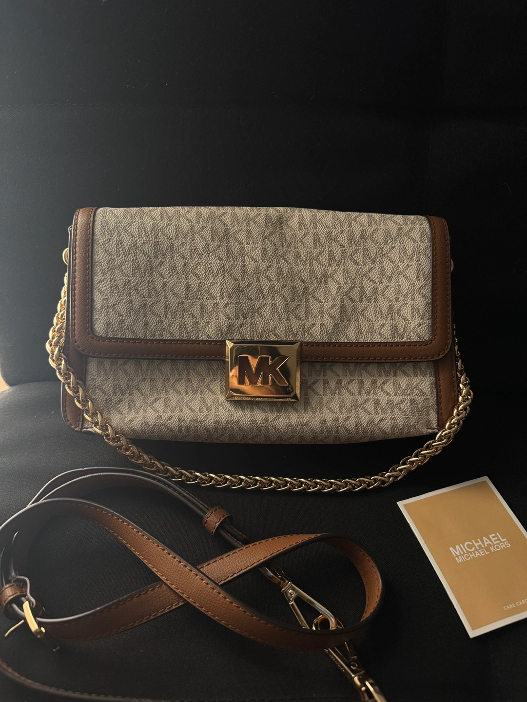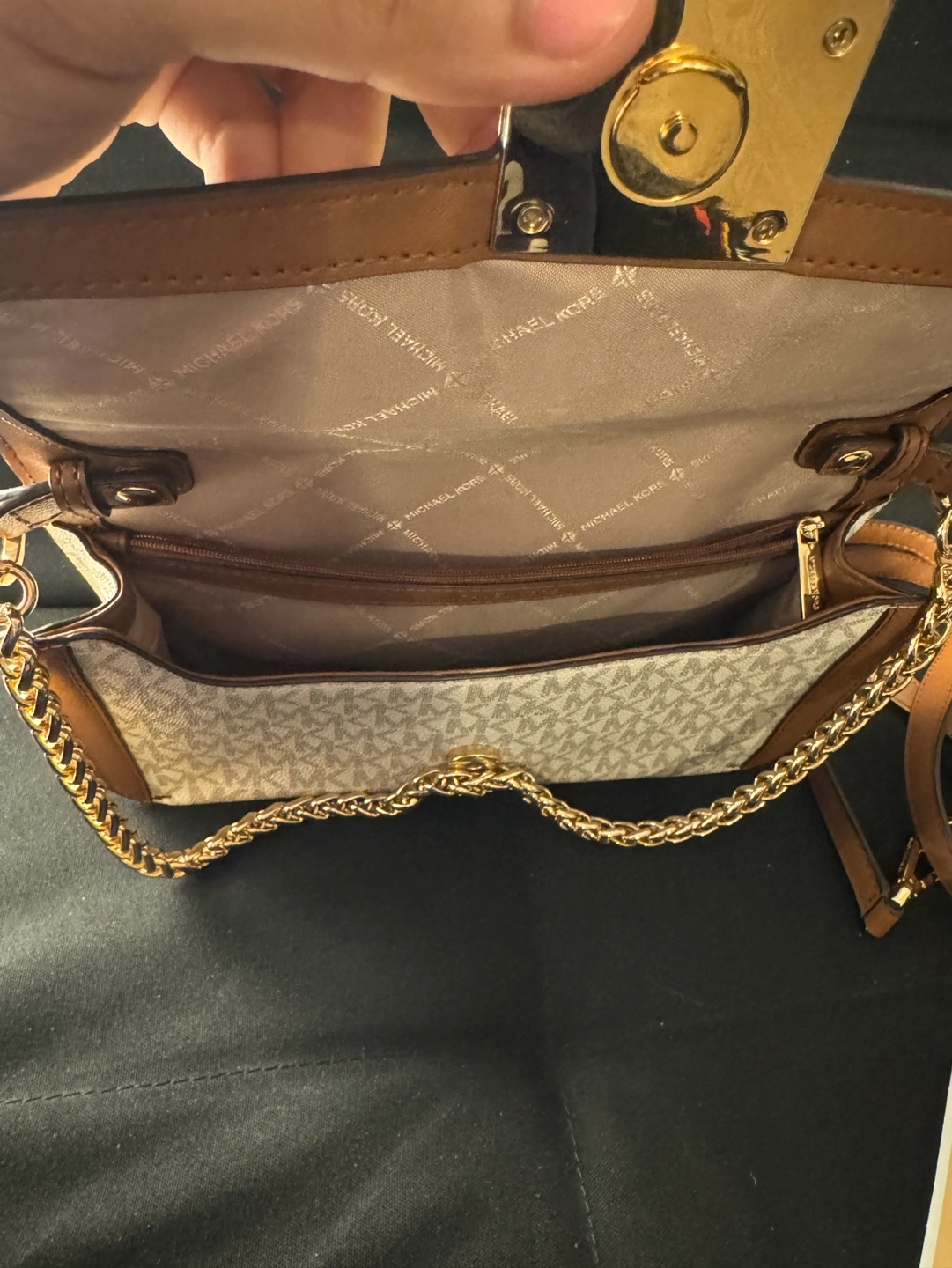 Beautiful Michael Kors crossbody bag. Features a gold chain strap and brown leather accents. Subtle MK logo pattern. Perfect for everyday use. Used only once.