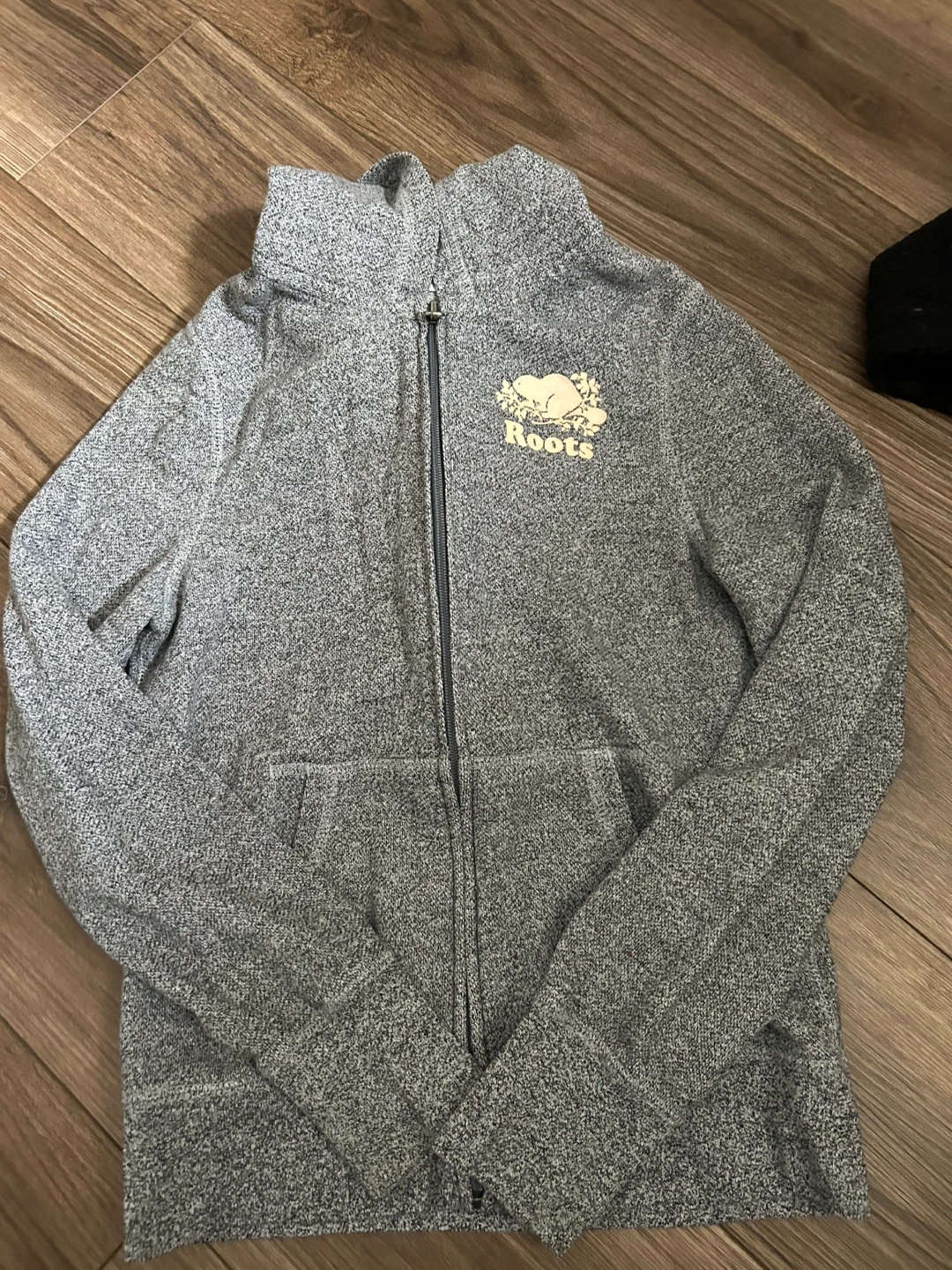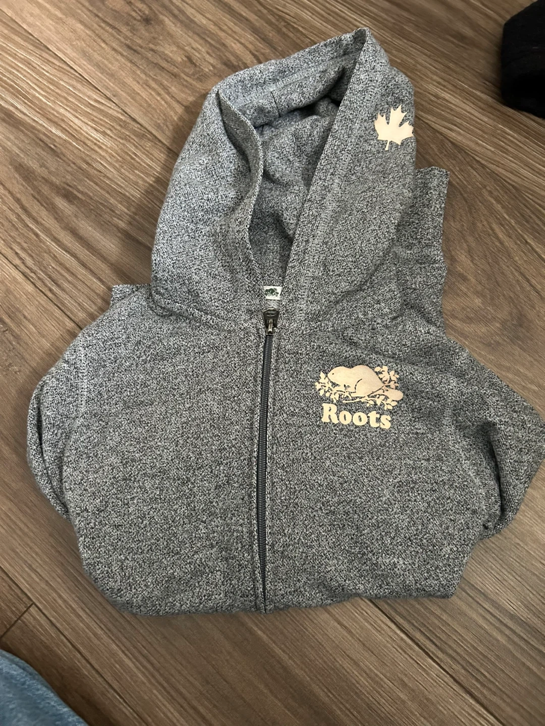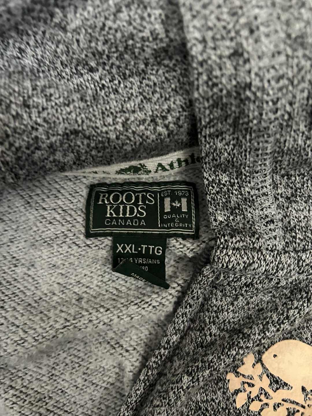 This is a Roots Kids zip-up hoodie in grey. It's a size XXL, fitting roughly 12-14 years. Made from a soft cotton blend for comfort.
