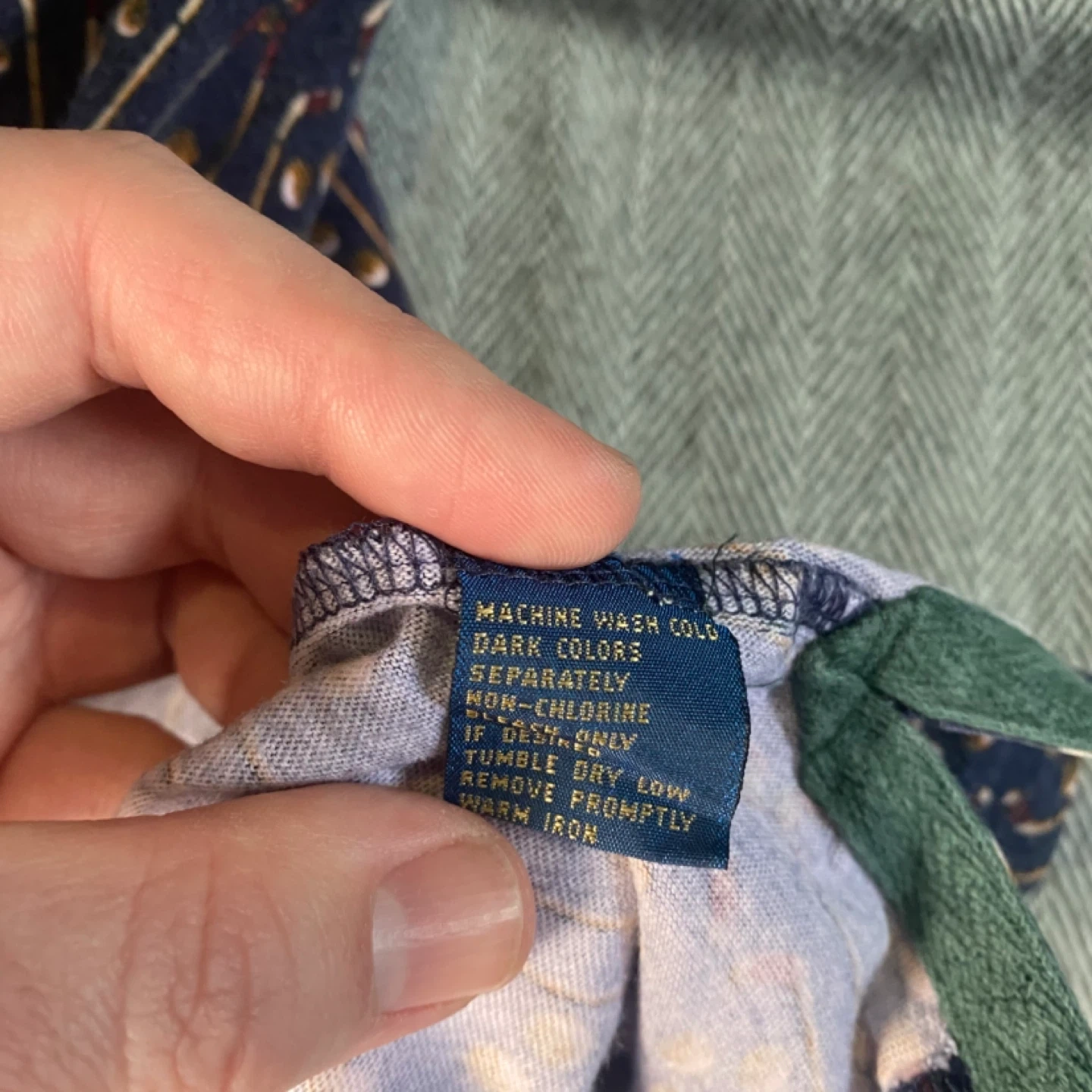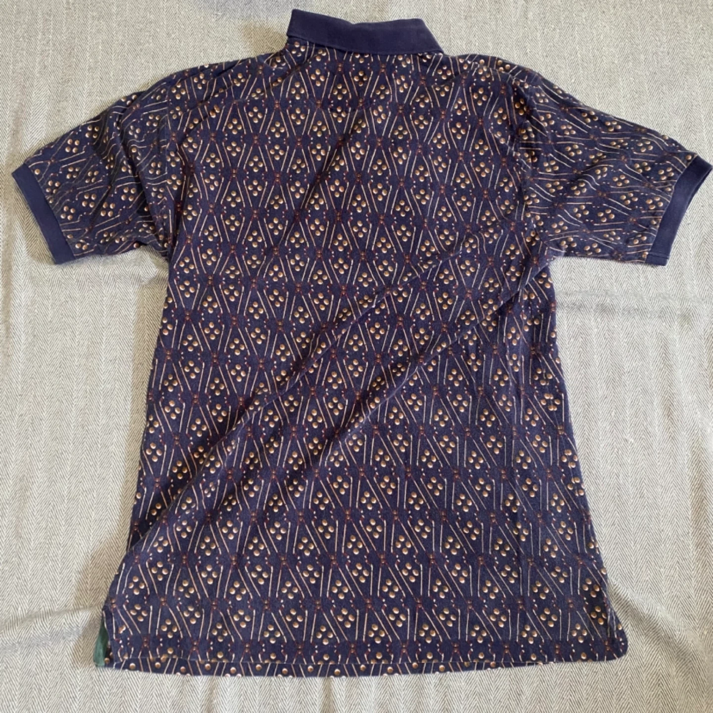 Vintage Chaps Ralph Lauren short-sleeve polo shirt. 100% cotton material. Made in the Philippines. Features a repeating pattern.
