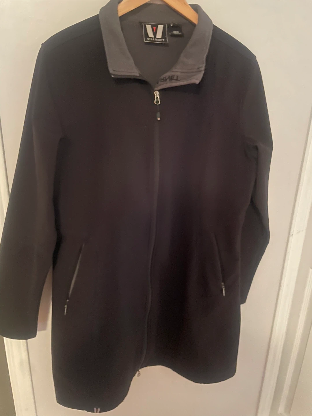 Vuarnet zip-up jacket in a size 14. It's a dark grey colour with a contrasting lighter grey collar. It's made of a softshell material.