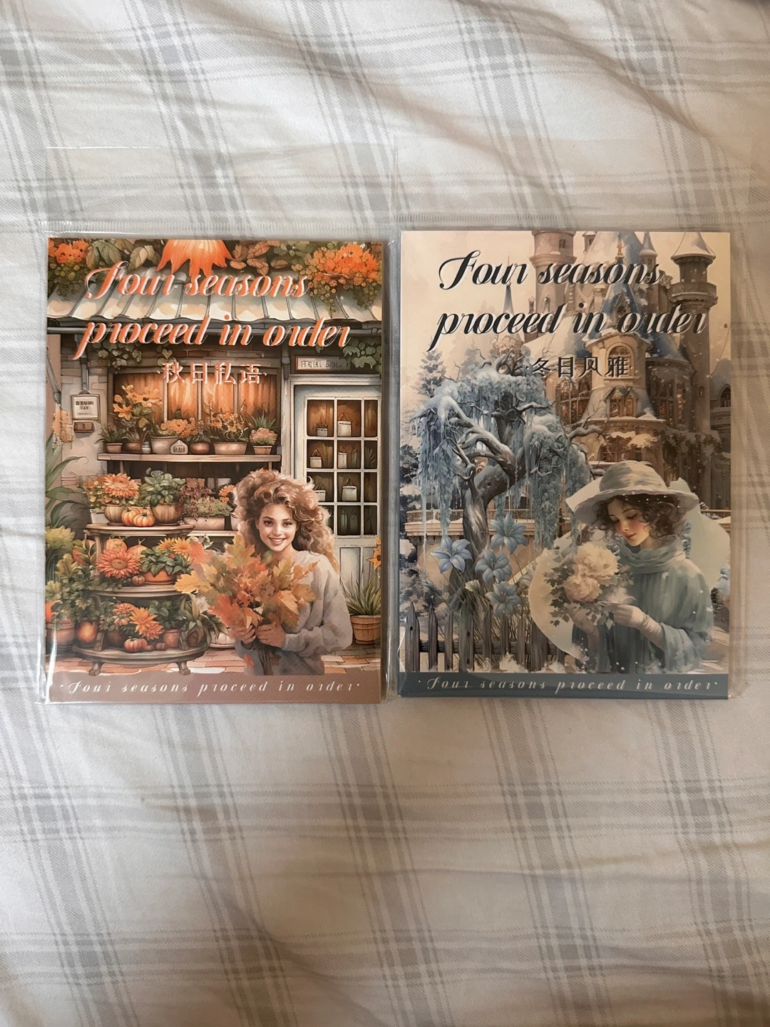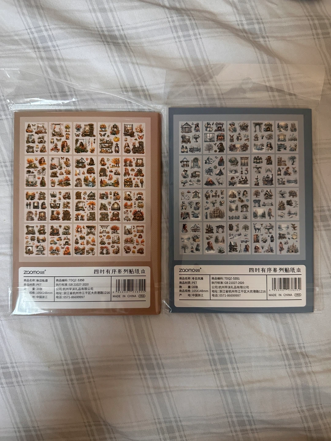 Two packs of Zoomose "Four Seasons Proceed in Order" stickers. Includes autumnal and winter scenes. Each sticker sheet measures 160x248mm. Perfect for journaling and crafting projects!