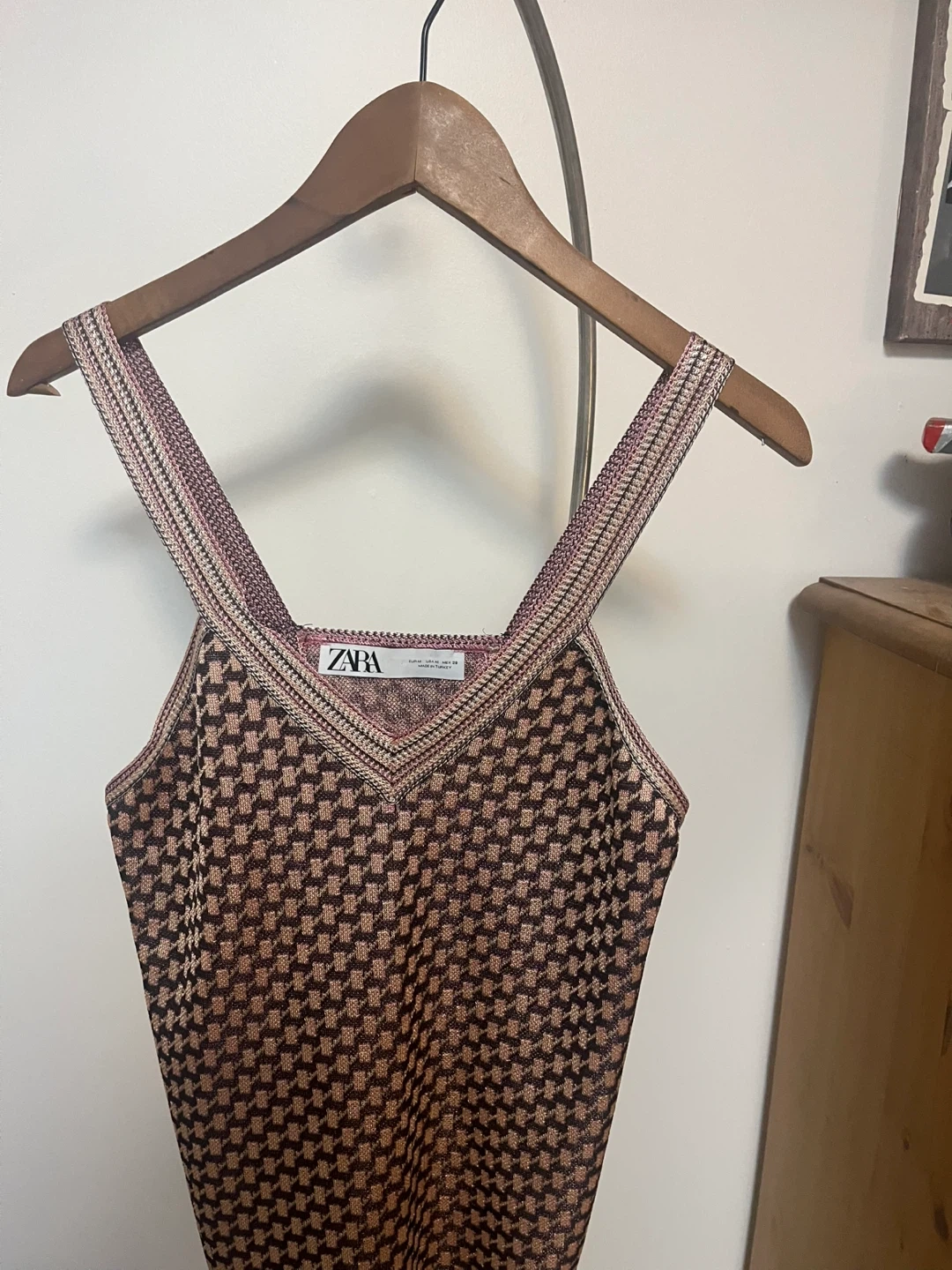 This is a Zara knit tank top. It features a V-neck and a houndstooth-style pattern with metallic threads. It's perfect for adding a touch of sparkle to your outfit!