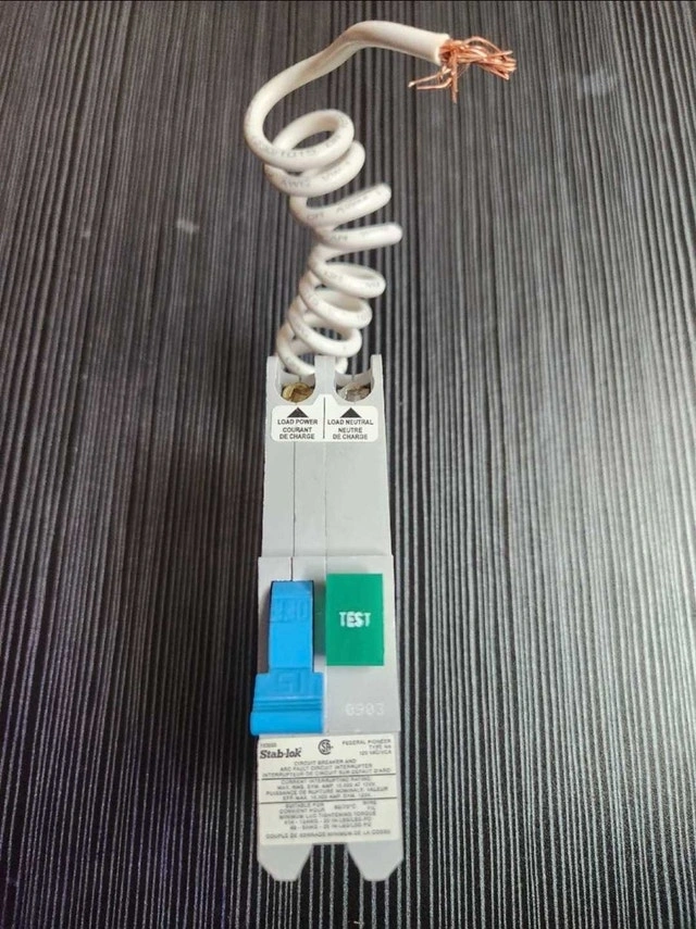 Used, single-pole Federal Pioneer Stab-lok Type NA-AFI circuit breaker with Arc Fault protection (AFI). This breaker was removed from a working panel. Key Features: Type: Stab-lok Circuit Breaker and Arc Fault Circuit Interrupter (AFI). Voltage: 120V AC. Interrupting Rating: Max. RMS Sym. 10,000 Amp. Function: Designed to protect against dangerous electrical arcing (sparks) to prevent fires. Condition: Used, with white coiled neutral pigtail wire present. IMPORTANT NOTE: Due to the nature of used electrical safety components, this item is sold AS IS. It is the buyer's responsibility to verify compatibility with their existing panel and local code requirements (CEC). Installation MUST be performed and inspected by a certified, licensed electrician. Cash accepted.