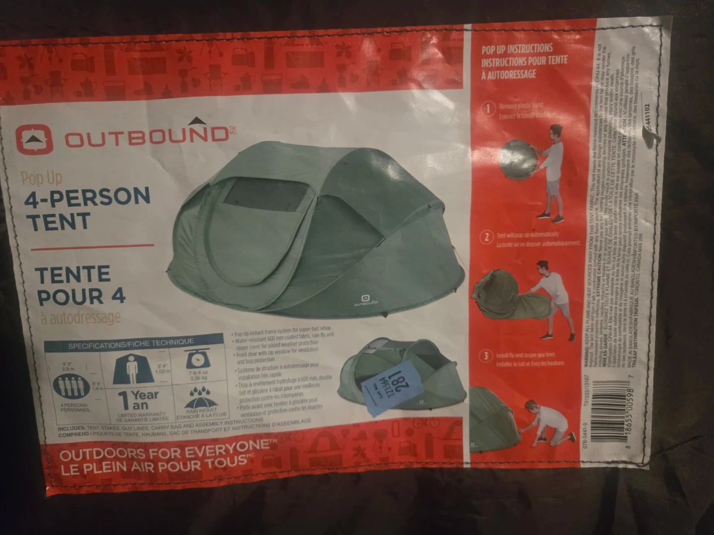 Outbound pop up 4-person tent. Easy set up with instant frame system. Water-resistant 600mm coated fabric, rain fly and zipper rain cover. Features double layer doors with window for ventilation and bug protection. Includes tent, stakes, guy lines, bag and instructions. Some tent pegs are bent