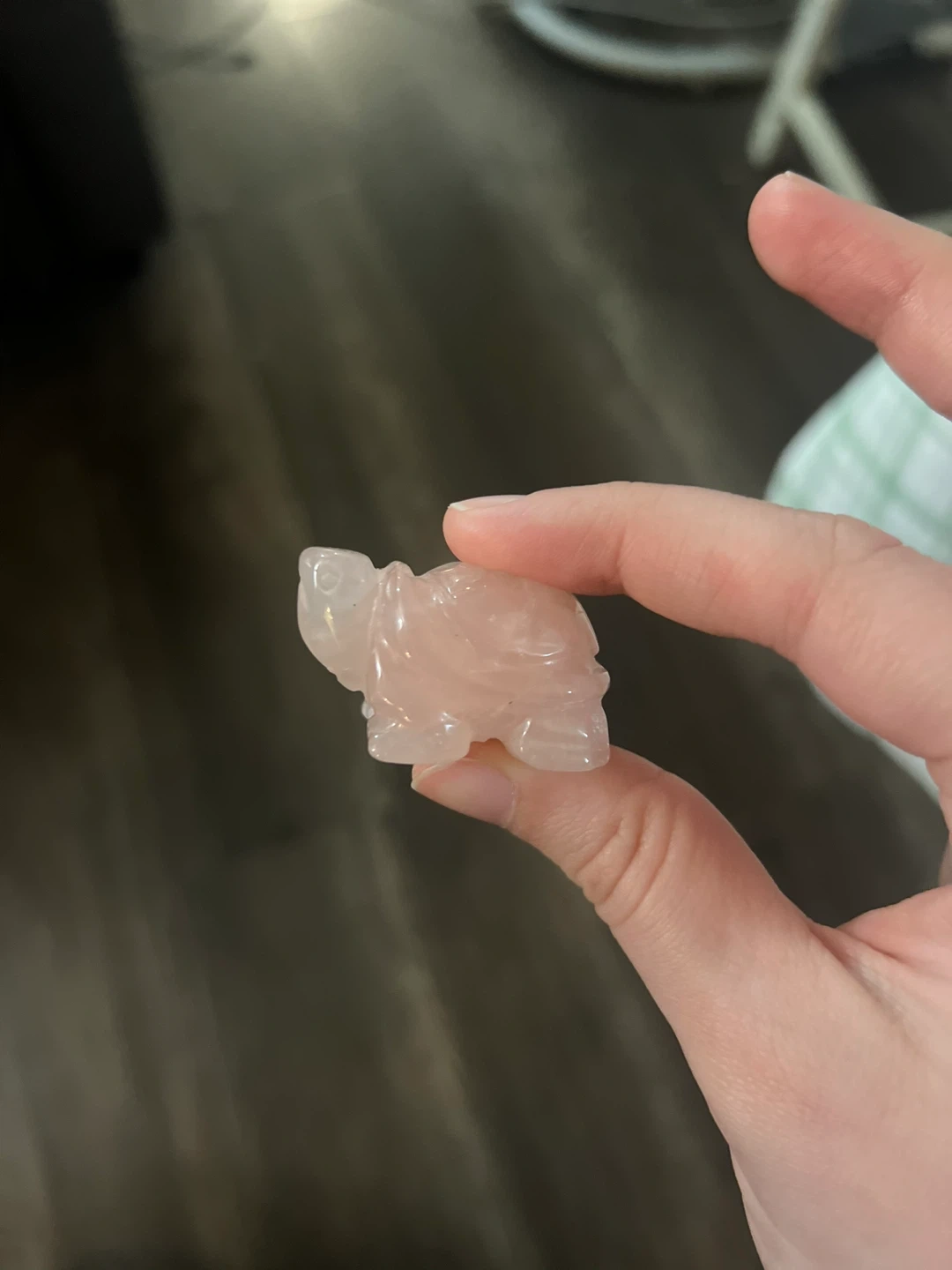 This is a lovely rose quartz turtle carving. It's a small decorative piece, perfect for adding a touch of charm to a shelf or desk. The material is rose quartz.