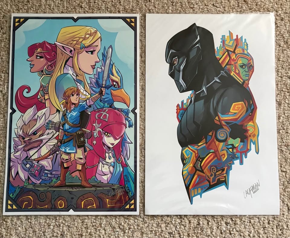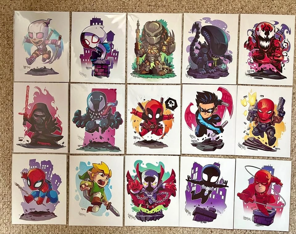FULL LOT: $220. Individual Letter size prints: $15 each. Larger Prints: $30 each. Selling a collection of 15 signed Derek Laufman art prints from my personal collection. All prints are standard letter size and have been kept in protective sleeves in mint/excellent condition. Characters include Spider-Man, Spider-Gwen, Deadpool, Carnage, Link, Alien, Predator, Red Hood, Nightwing, Kylo Ren, Venom and more. These are artist prints signed by Derek Laufman and are great for collectors or fans of comic, gaming, and pop culture art. Selling as a bundle or possibly individually depending on interest. Message me if you want specific characters.