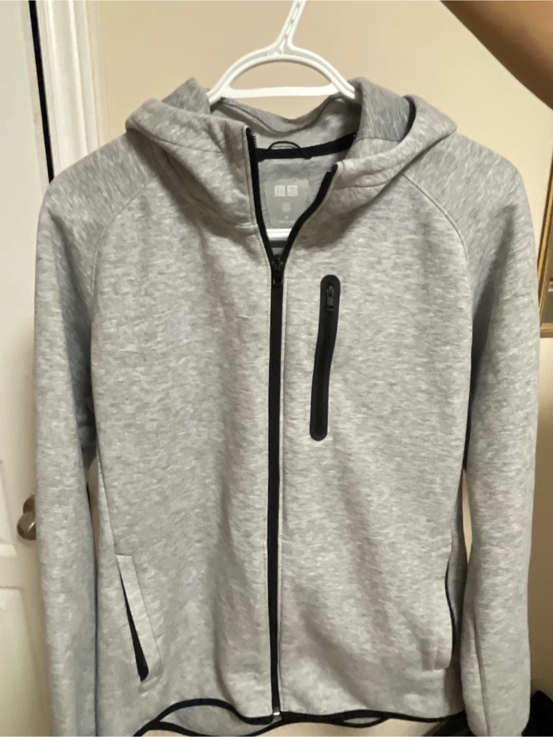 This is a Uniqlo grey full-zip hoodie. It's a size medium and features a chest pocket with a zipper. The fabric is lightweight and breathable.
