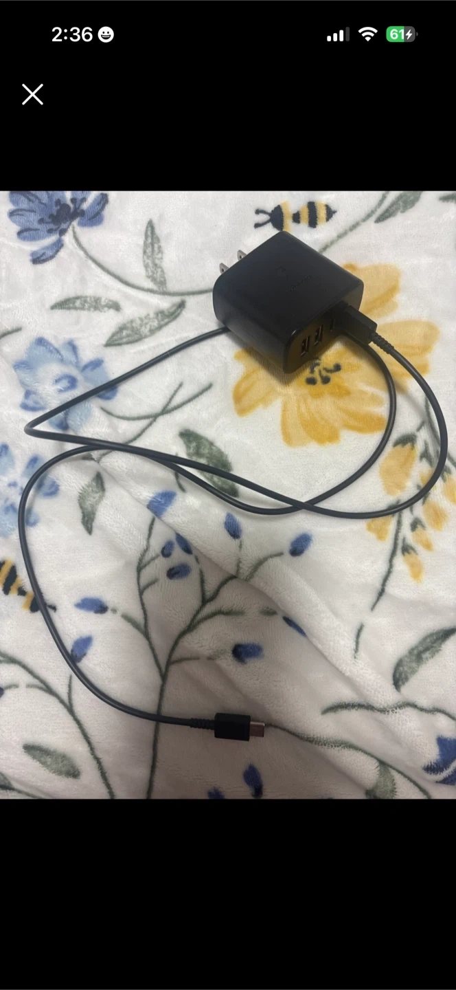 Black Samsung wall charger with three USB-A ports and a USB-C port. Includes a USB-C to USB-C cable. Great for charging multiple devices at once! Pick up cash only