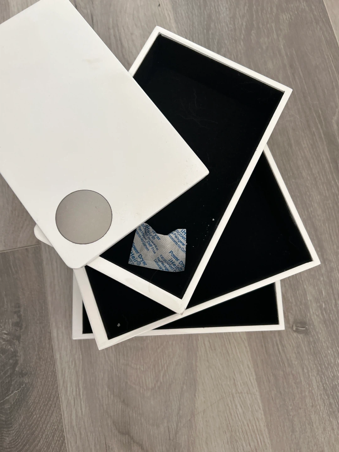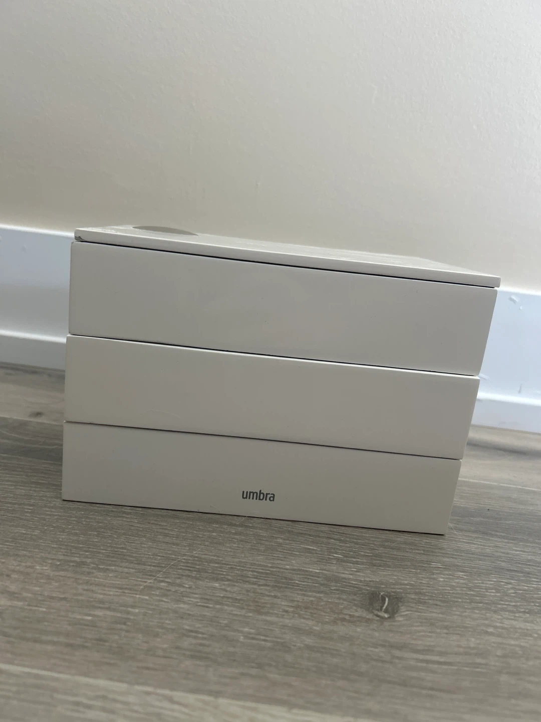 Selling an Umbra Stowit storage box in a sleek white and black colour scheme! This stylish box is perfect for keeping your small items organized and out of sight. It's in great condition and comes with the original box, so it's ready to use right away
