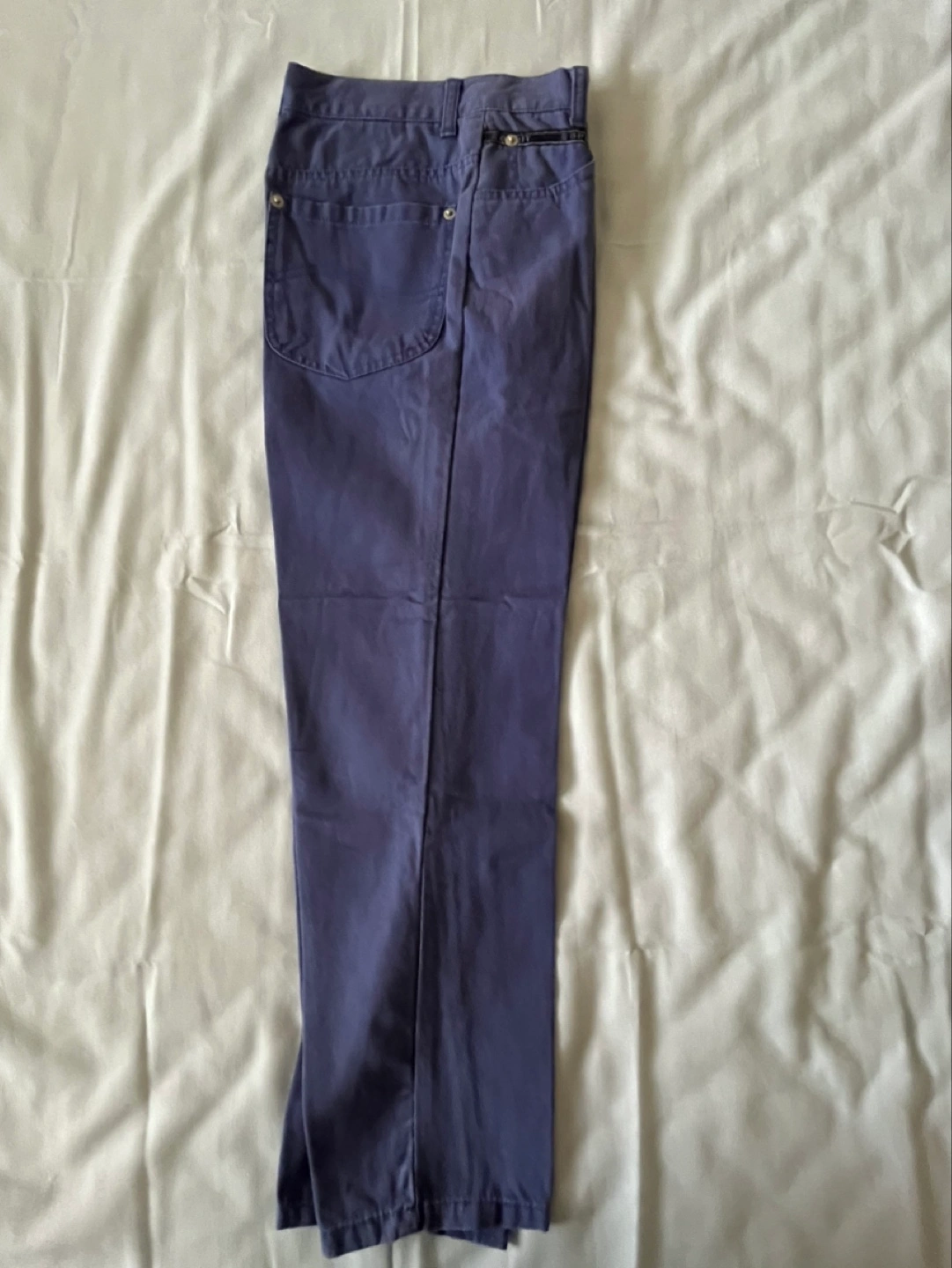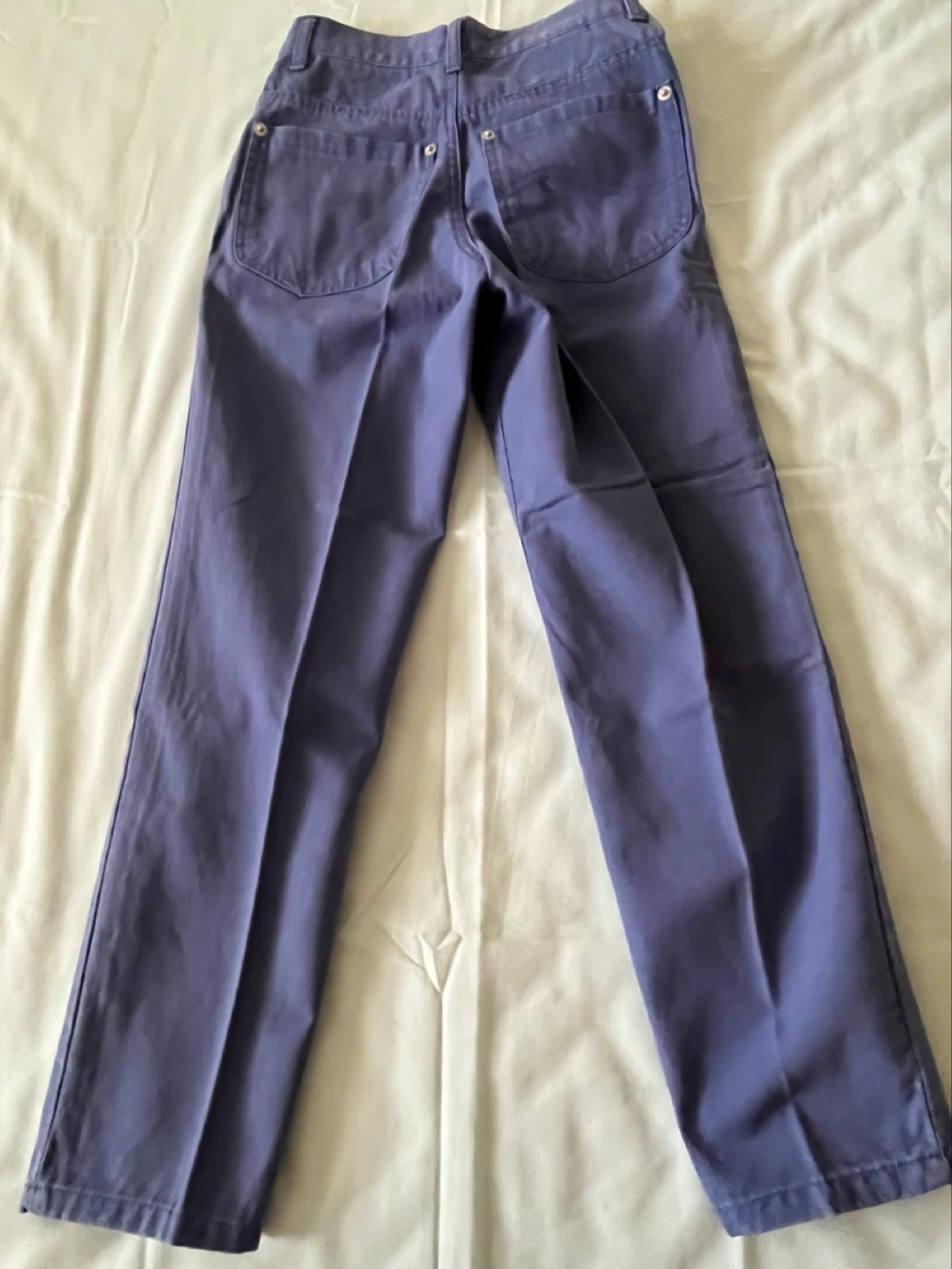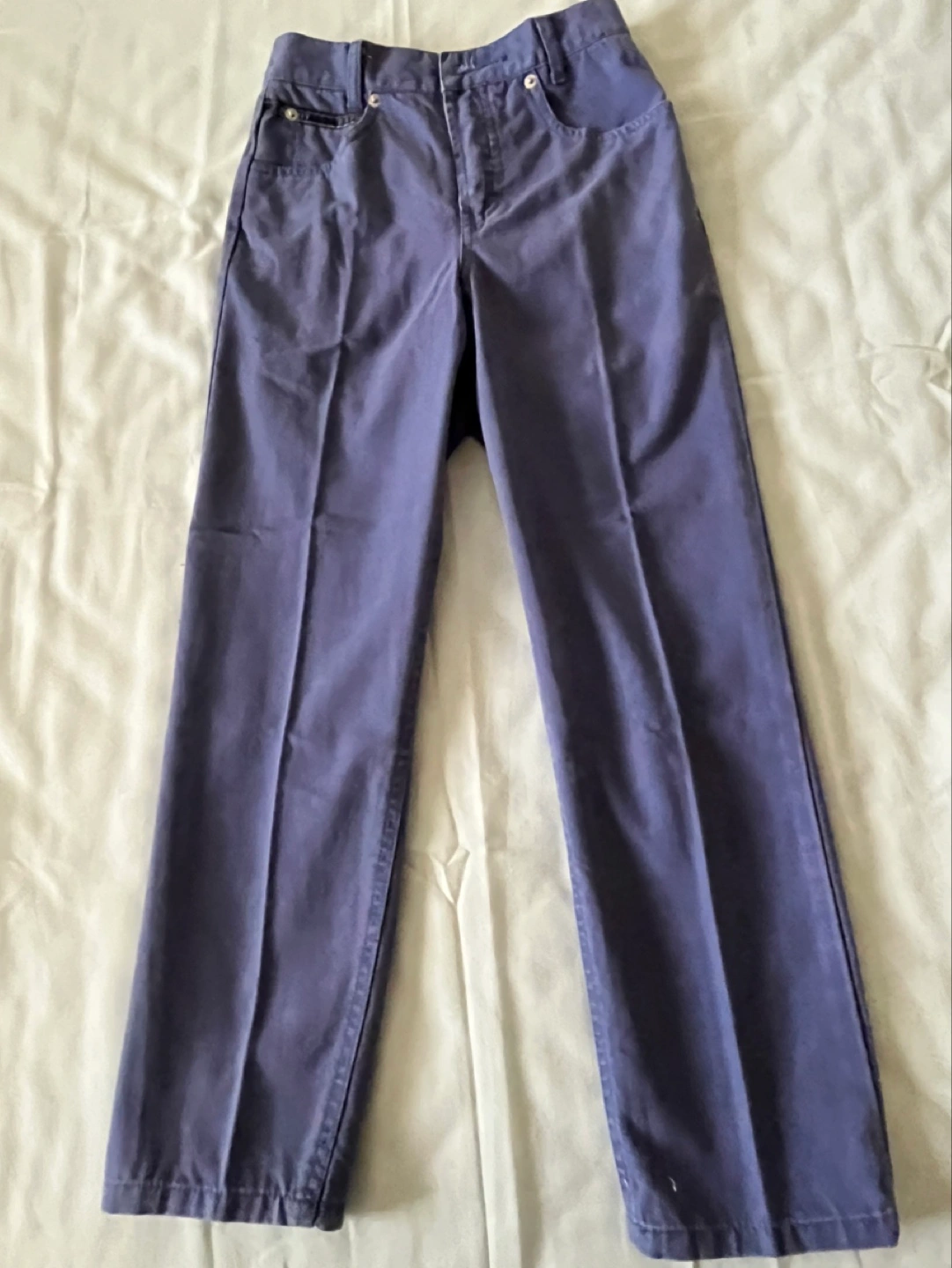 Purple straight leg pants with a zipper fly and button closure. Two front pockets and two back pockets. Good condition.