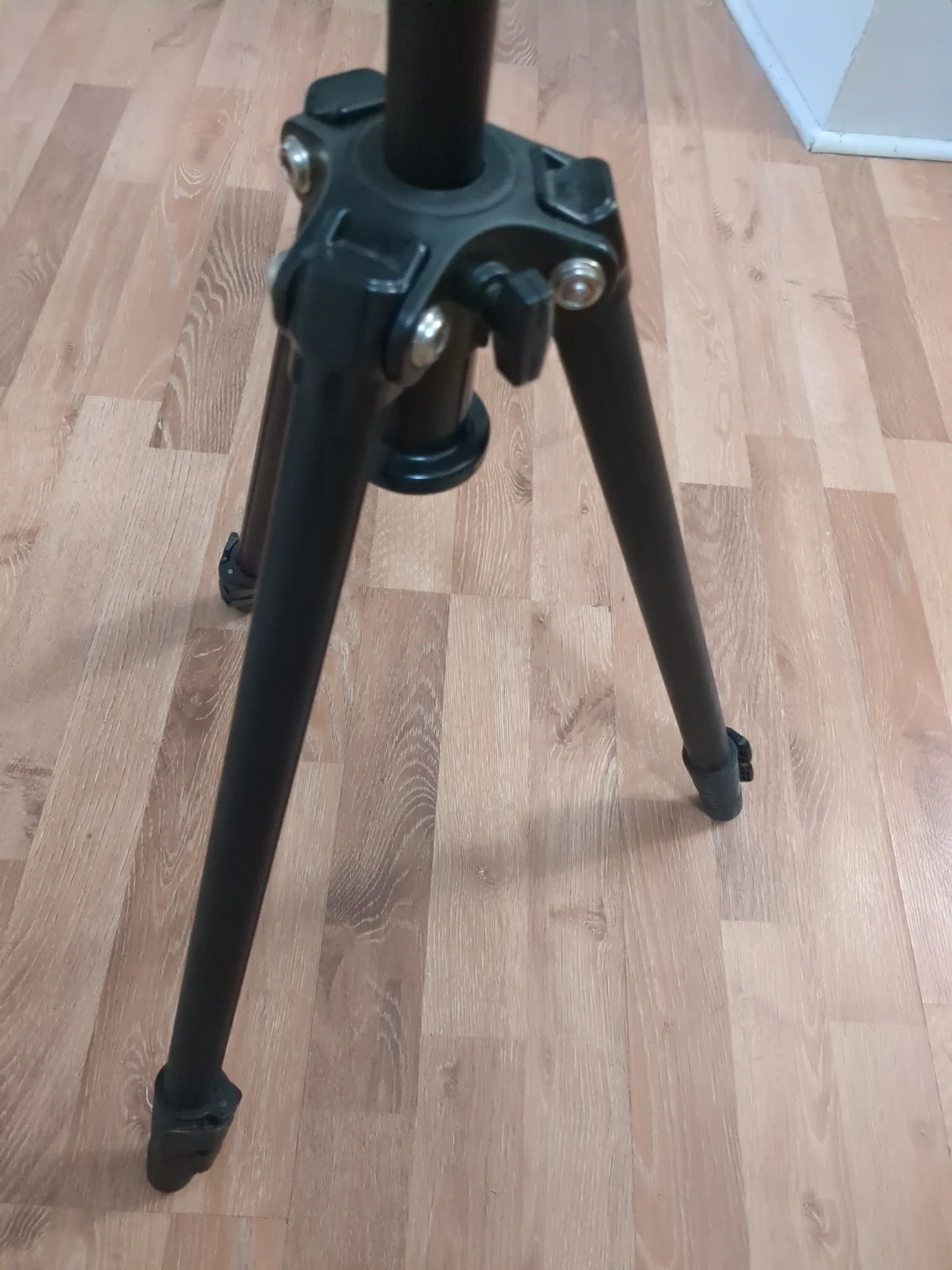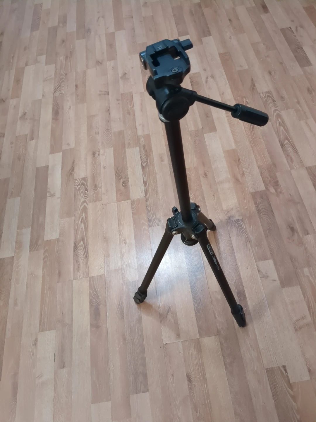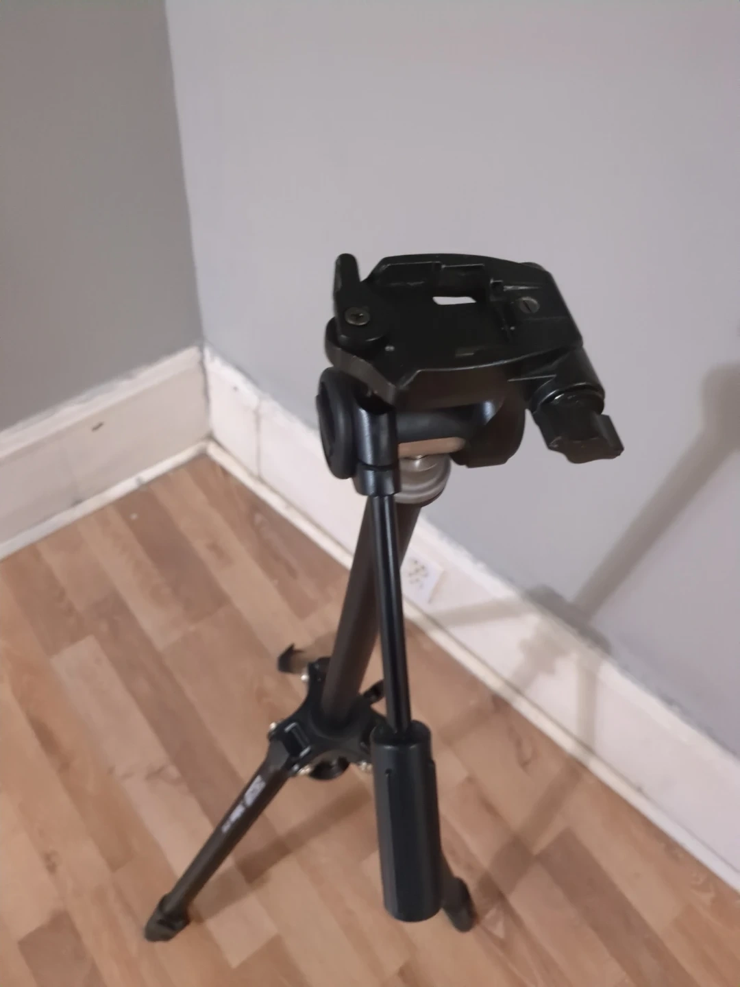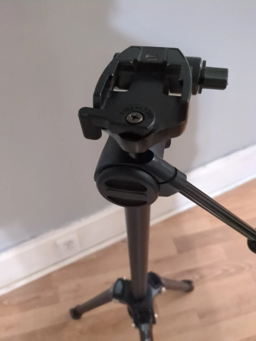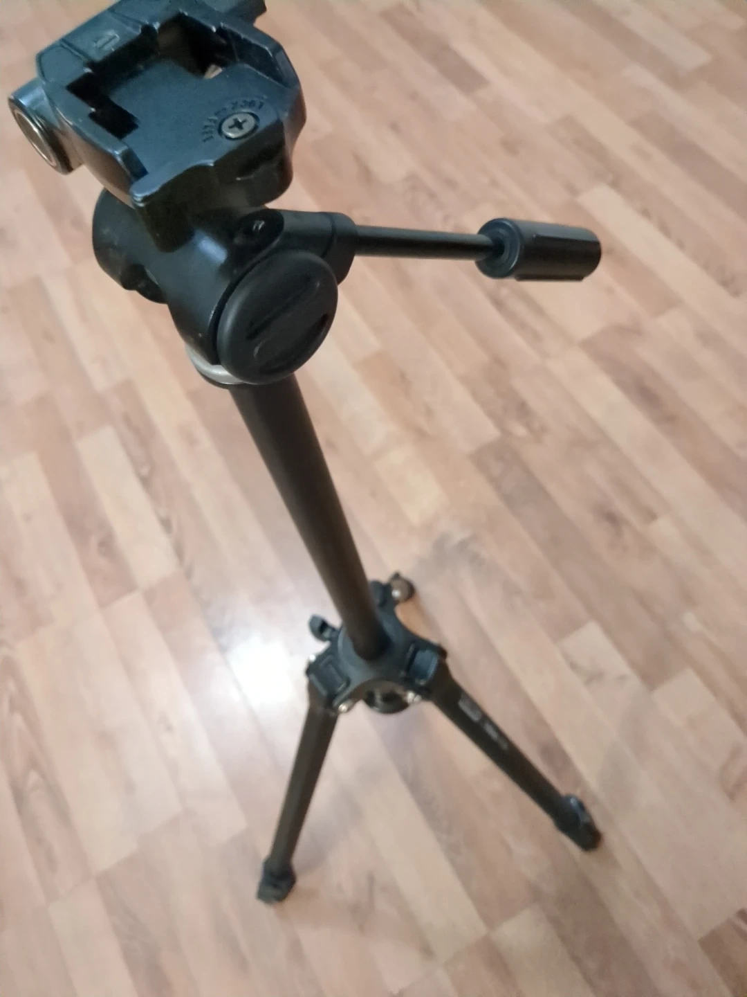 This is a Velbon HT100 Photo and Video Recorder Tripod distributed by Henry's. It's black with aluminum construction and lightweight. Pan Tilt Head, Features Quick Release Plate Latch/Lock for mounting cameras and telescopic leg sections.
