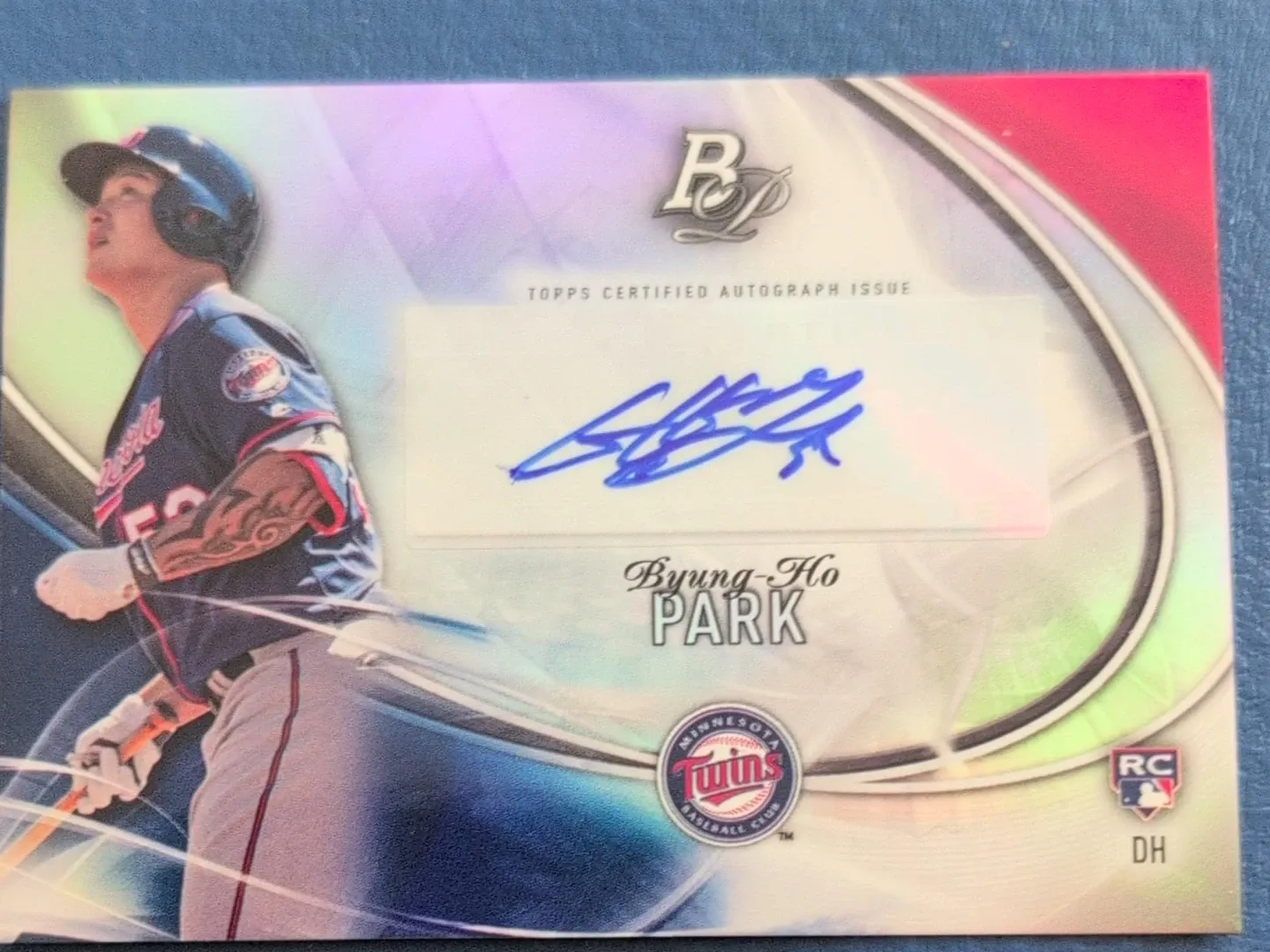 This is a 2016 Bowman Platinum Rookie Autograph card for Byung-Ho Park. It's a Topps Certified Autograph Issue and features his signature. The card commemorates his time with the Minnesota Twins.
