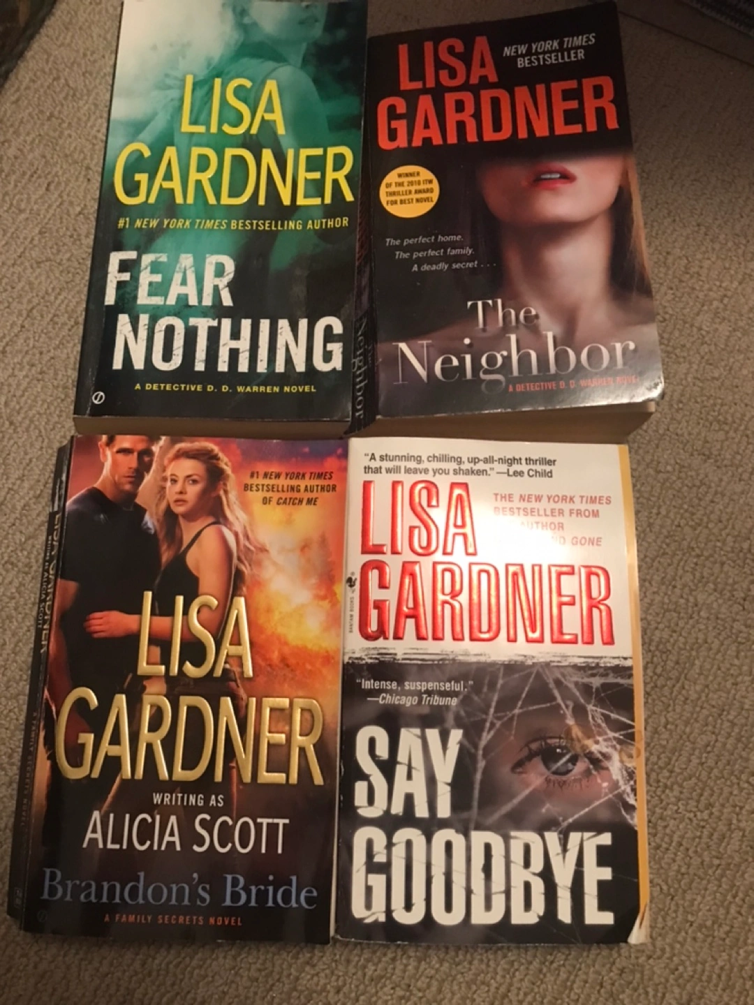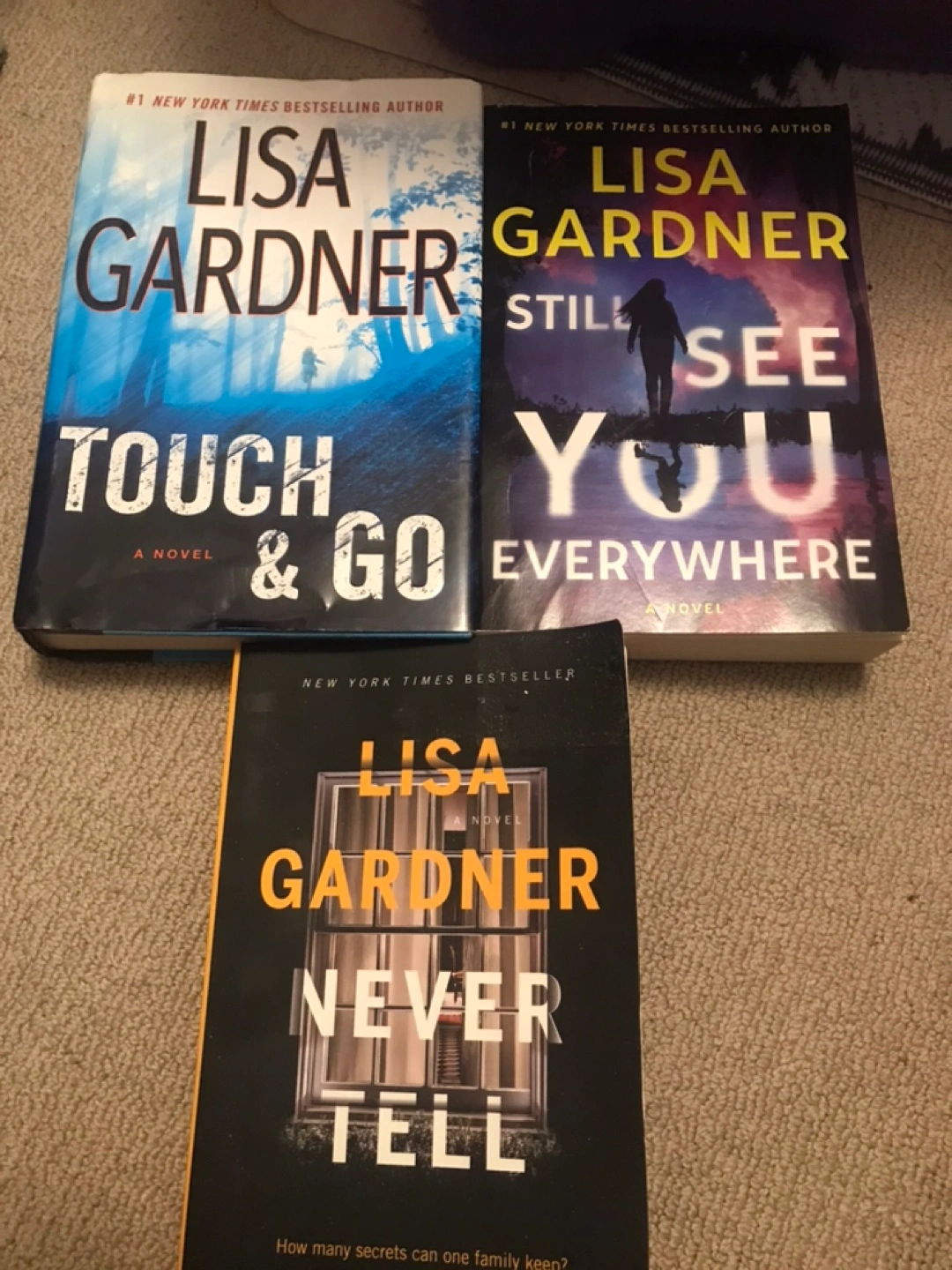 This is a lot of 7 paperback thriller novels by New York Times bestselling author Lisa Gardner. Books included are 'Touch & Go', 'Still See You Everywhere', 'Never Tell', 'Fear Nothing', 'The Neighbor', and 'Say Goodbye'. One book, 'Brandon's Bride', is written as Alicia Scott.