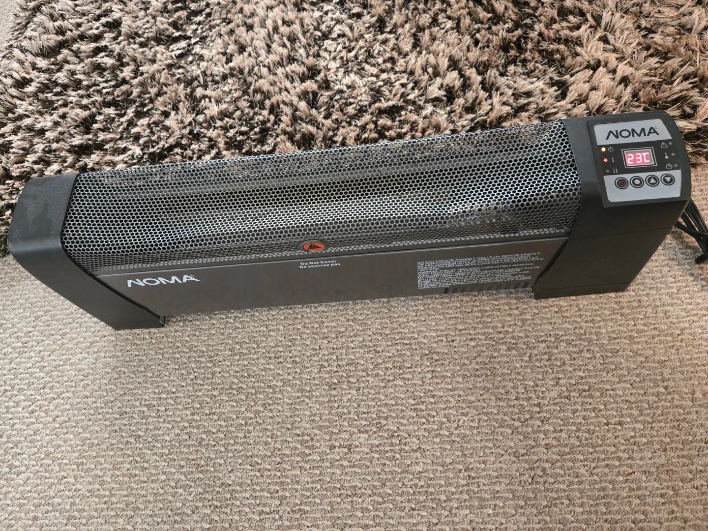 Noma electric heater with digital display. It has a black casing and a metal grille. Perfect for keeping any room warm! Grille has a slight bend which doesn't effect the unit.