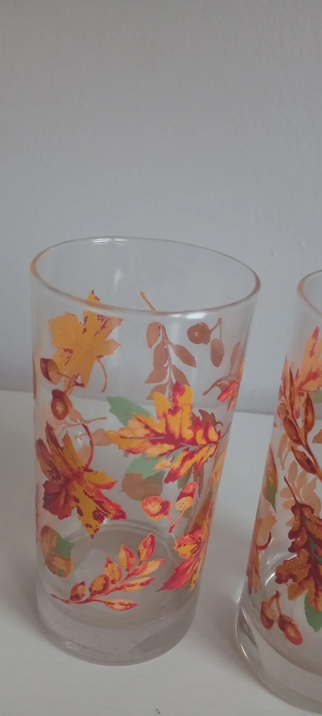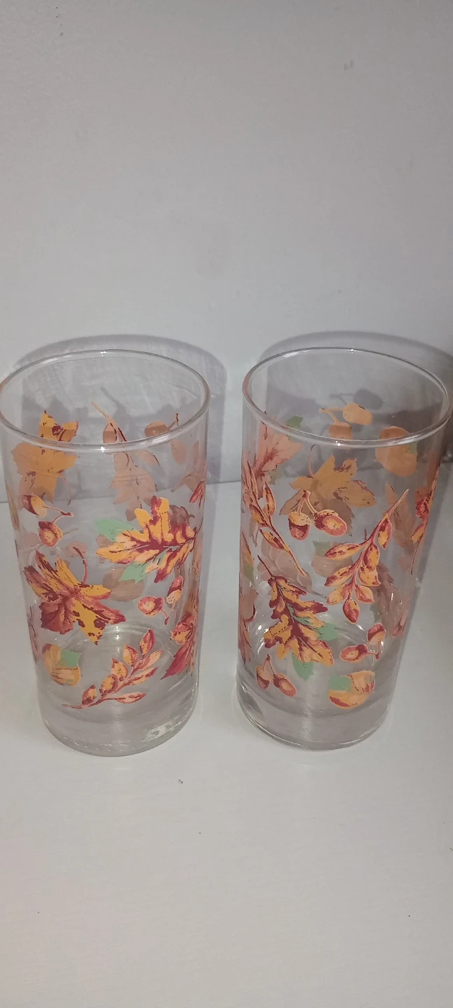 Two drinking glasses with a fall leaf pattern. Each glass holds 16.5 oz (488 ml). Made in Mexico.