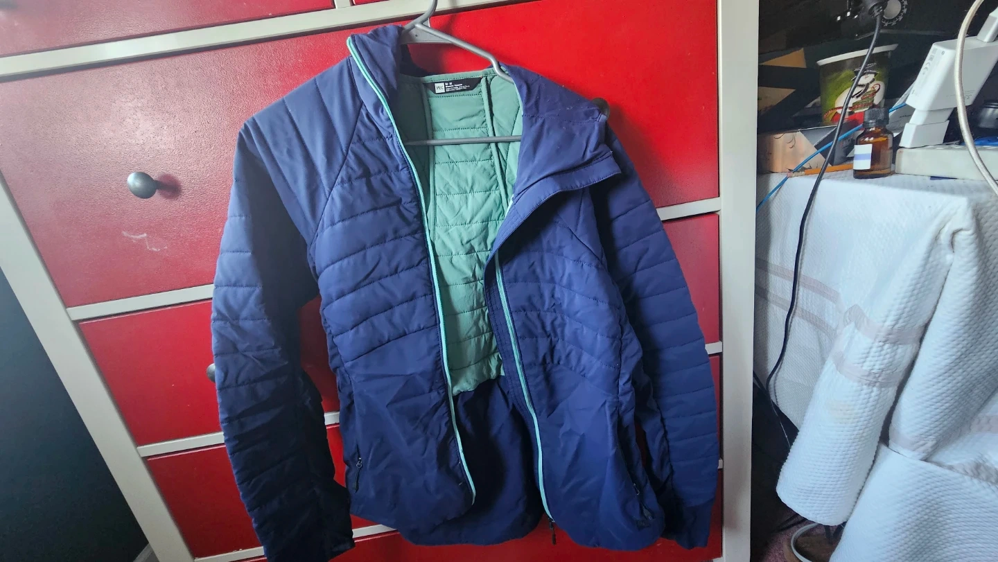 This MEC puffer jacket is designed in Canada and made in China. It's a women's size medium with a blue exterior and a green interior. The jacket has a hood and quilted detailing.