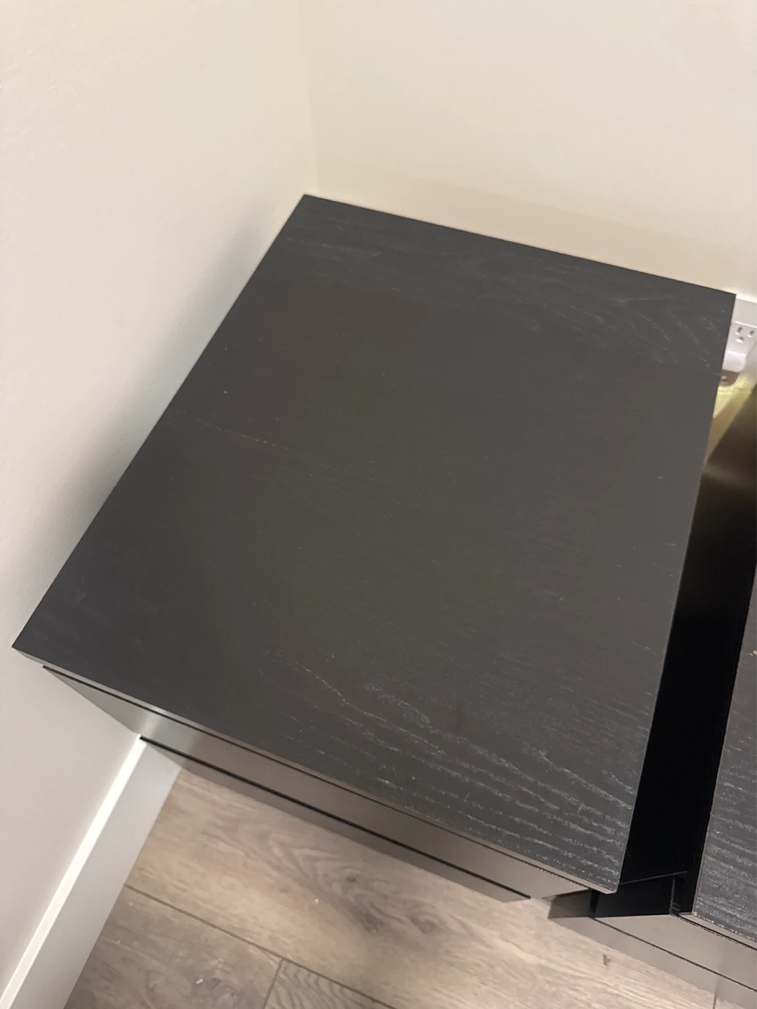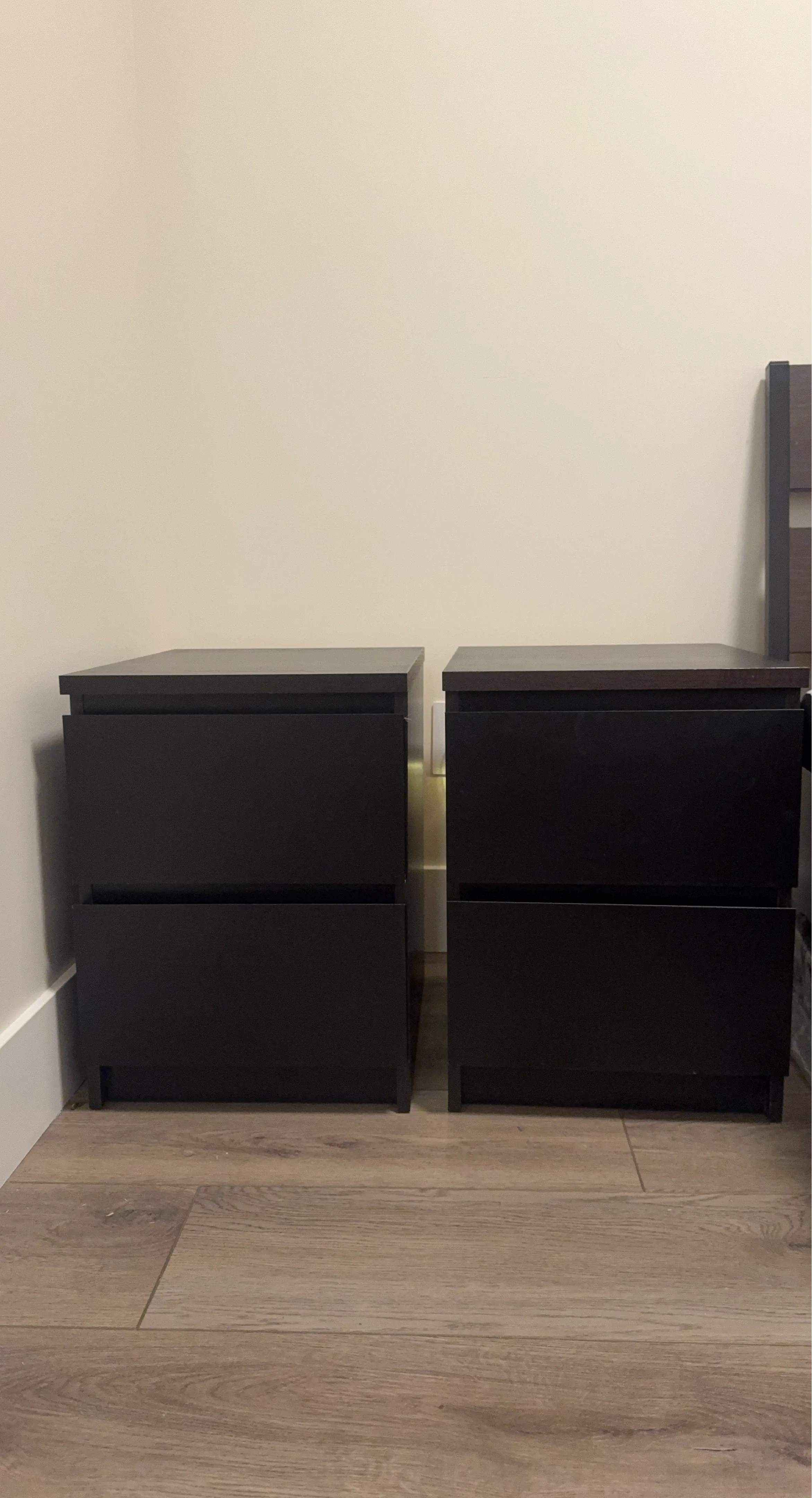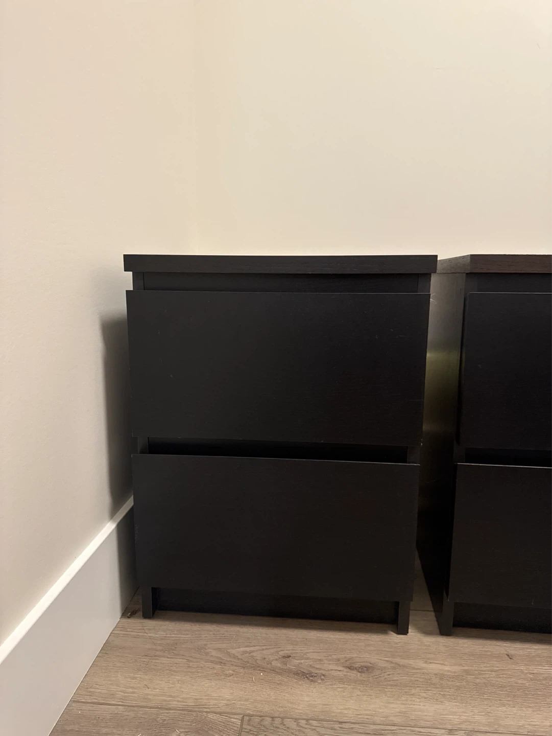 Selling a pair of black nightstands. Each has two drawers for storage. They're made of a dark wood-like material. Perfect for bedside storage!