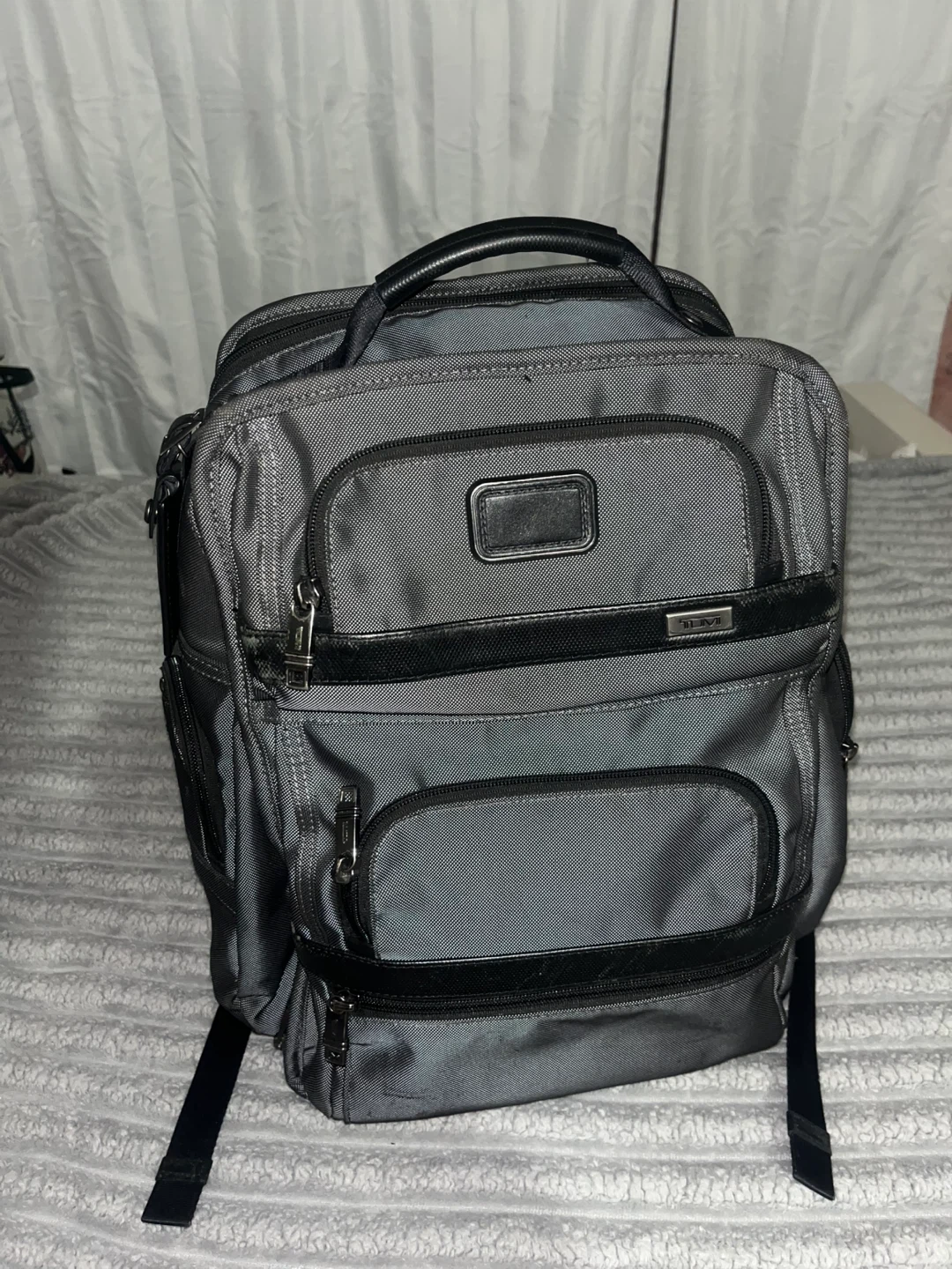 Selling a Tumi backpack in gray! It has a lot of compartments and is in great condition only wear like couple times always pack stuff in it no use for it come and get it now.