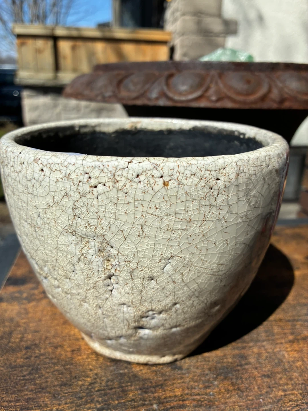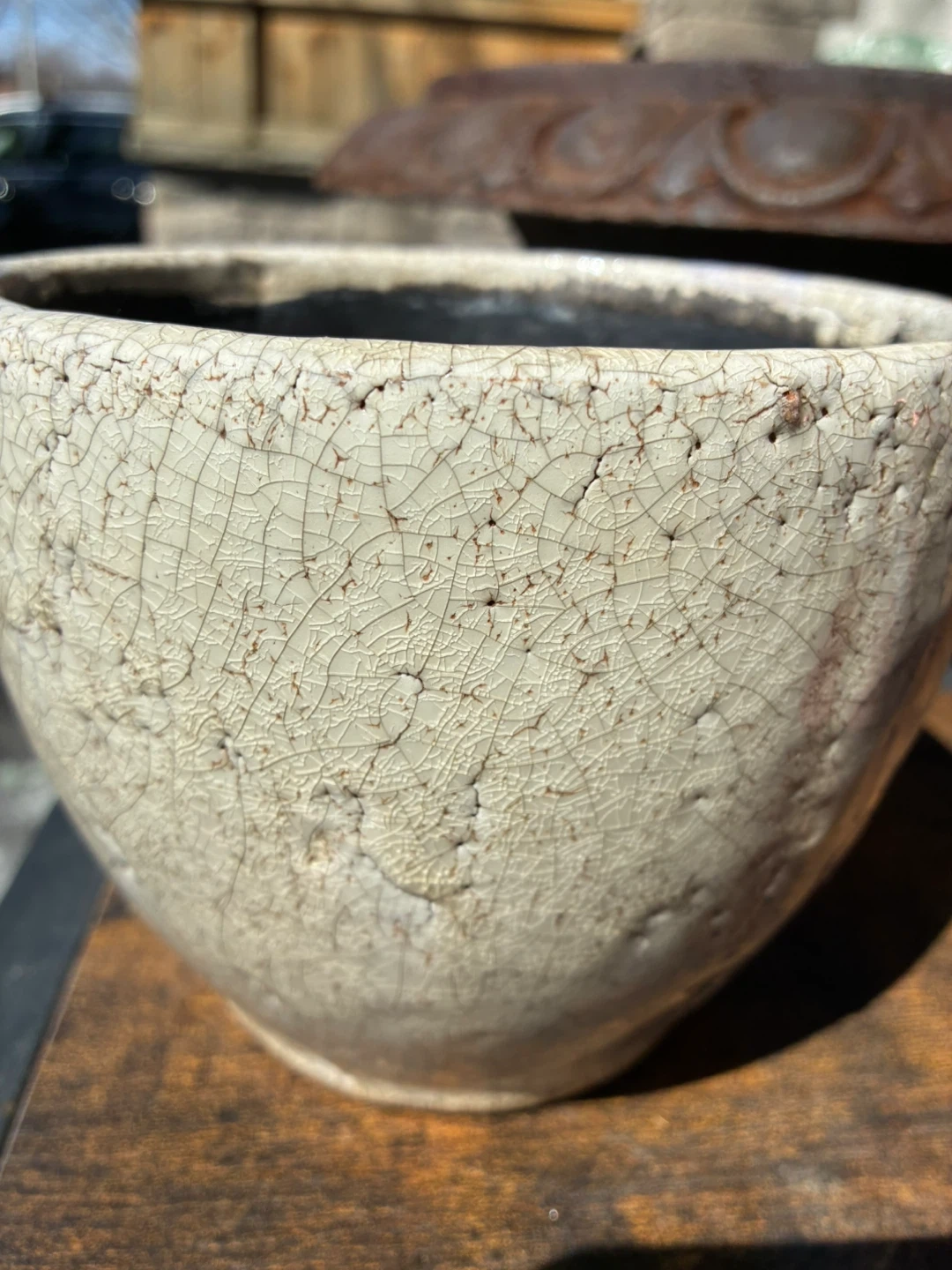 This is is a uniquely glazed mottled raku pot Has hole in bottom