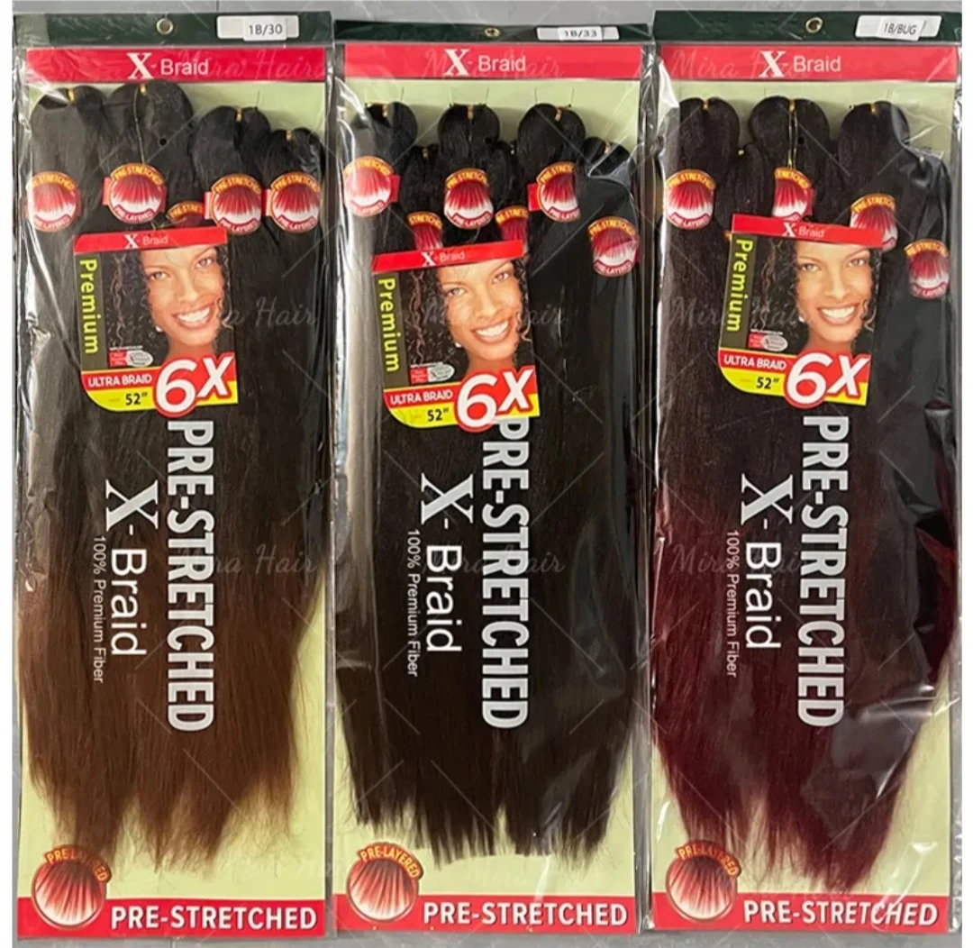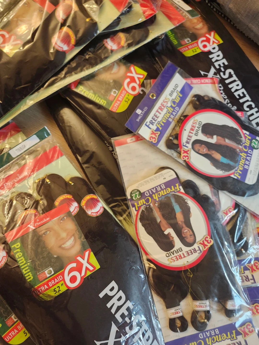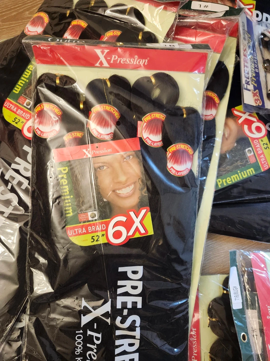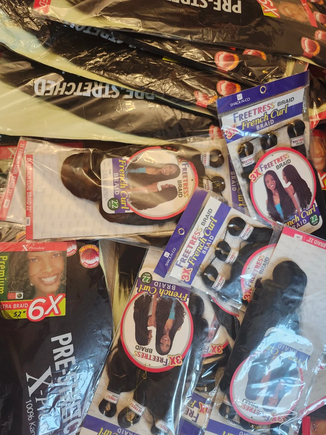Assortment of Freetress 3X French Curl Braids and X-Pression Pre-Stretched Ultra Braid hair. Multiple packs included, some are 22" and others are 52". Available in various colours.