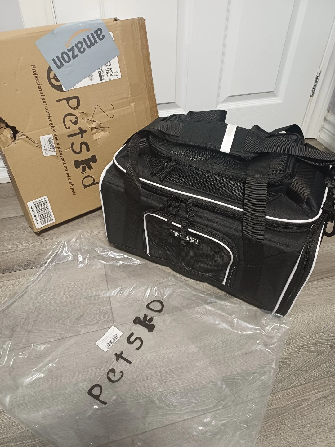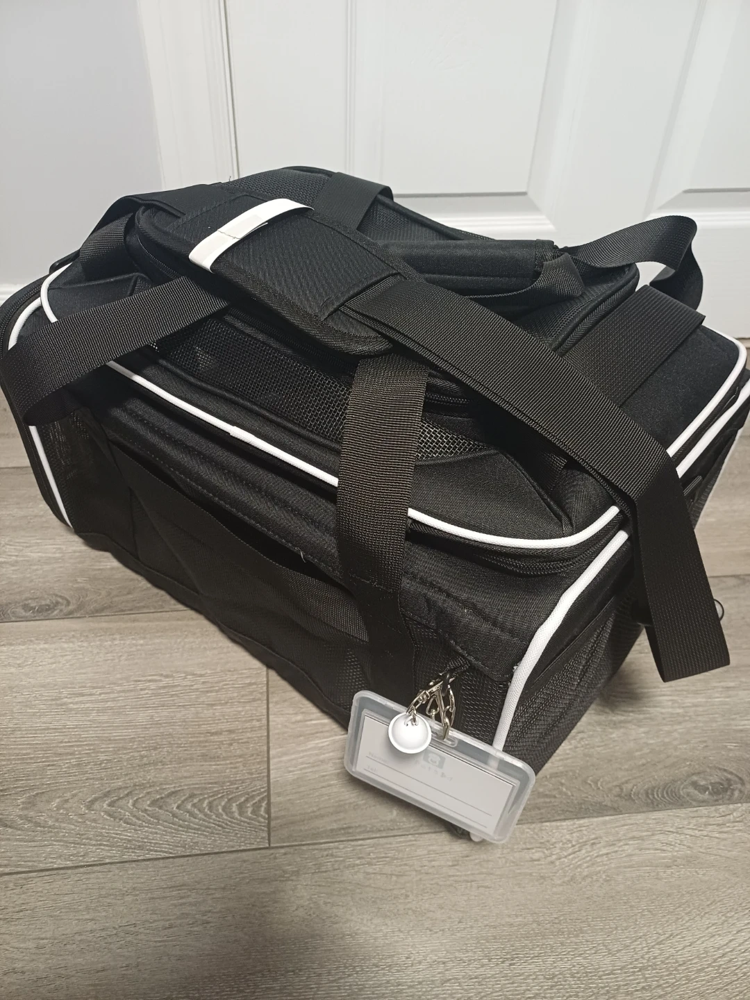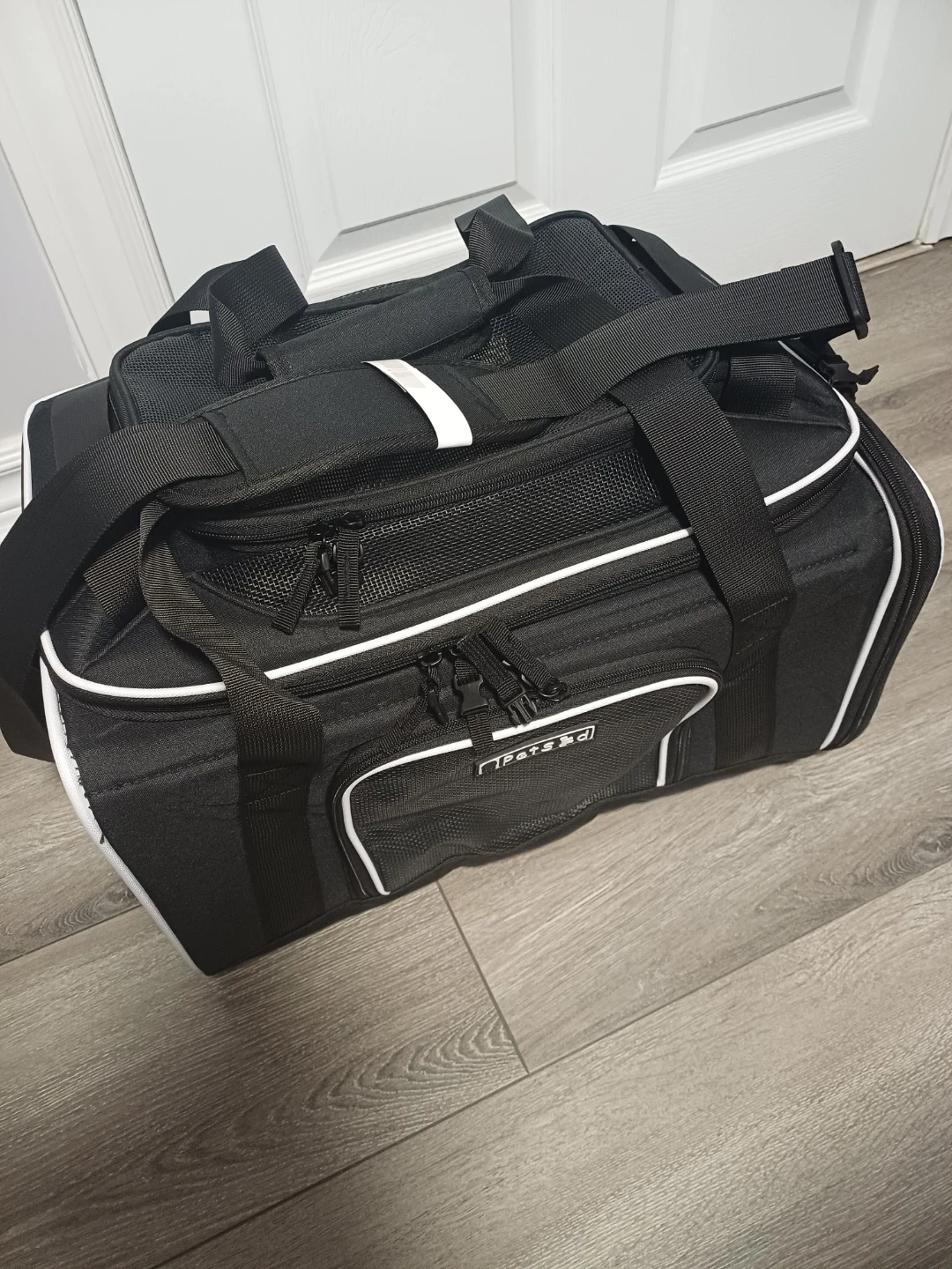 This is a black pet carrier bag from PetsGo. It features mesh panels for ventilation and for your pet's comfort with multiple zipper compartments for storage. It has both top handles and a detachable shoulder strap for easy carrying.
