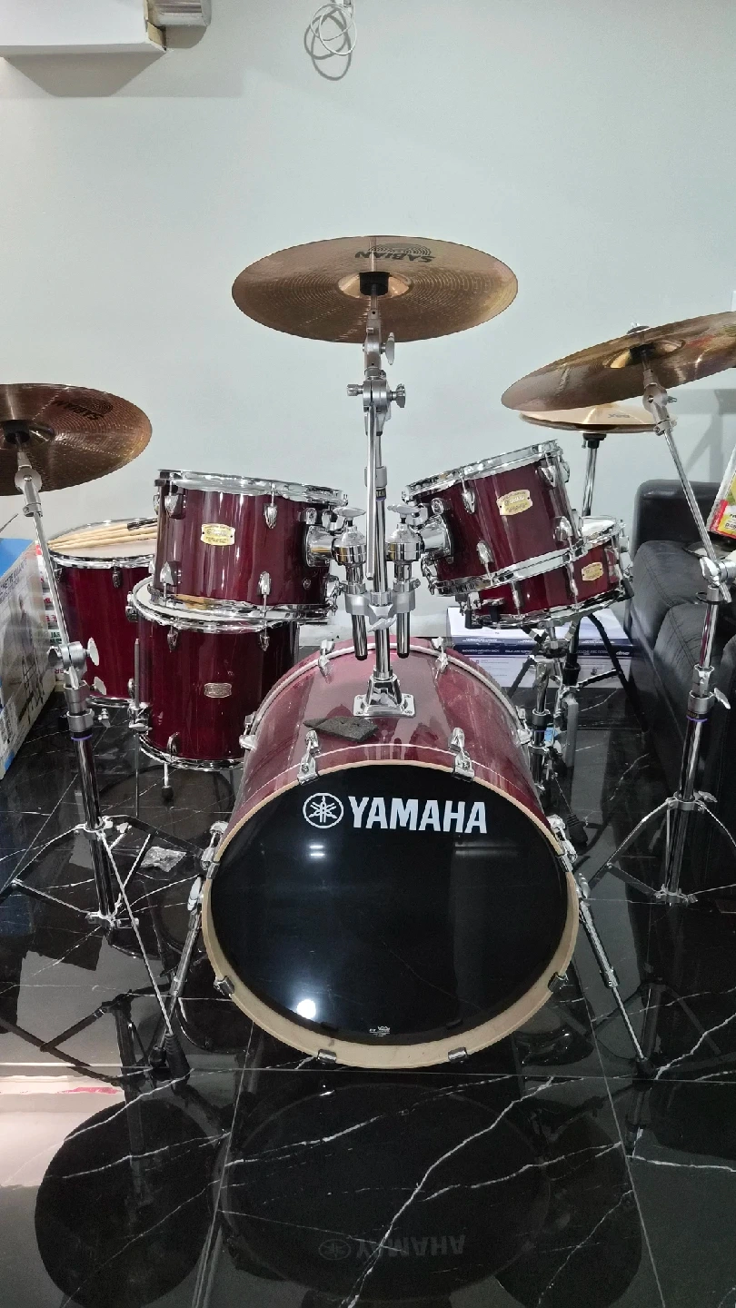 10Selling a Yamaha drum set in burgundy. It includes several drums and cymbals. Perfect for any drummer!