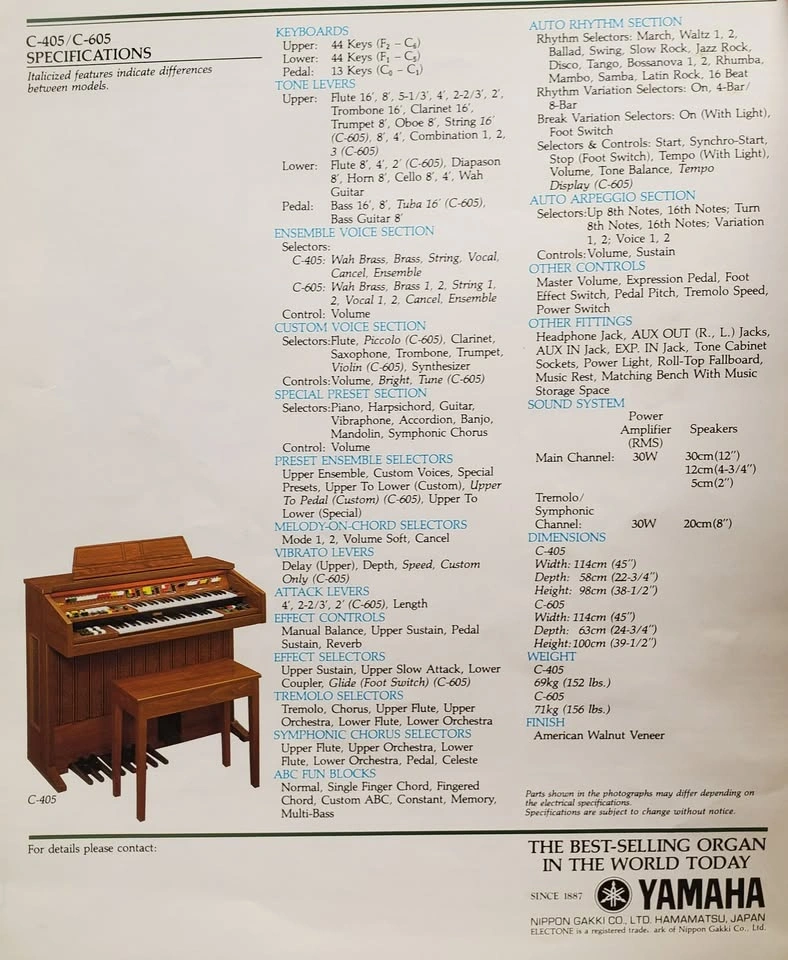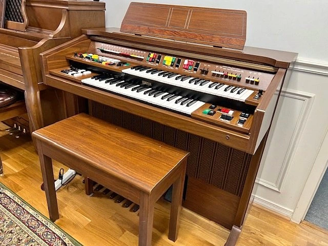 20 years old (bought in 2005), but hardly used. An electronic organ with multiple features, including a wide-range voice and ensemble selection, with two keyboards (upper and lower), and multiple pedals. Includes a headphone jack for quiet practice and a storage bench for materials and sitting on. Perfect for church services, school, and other events.