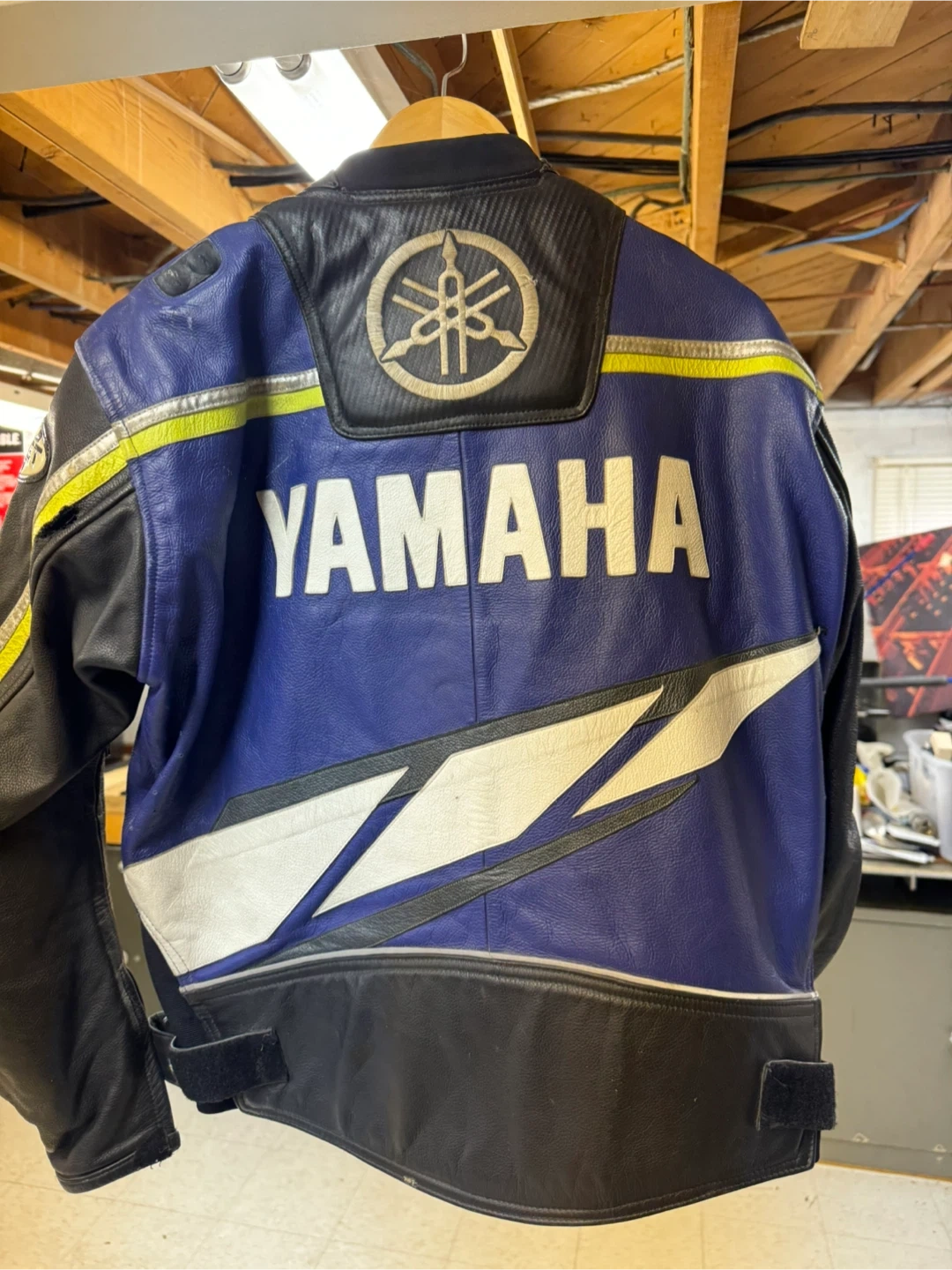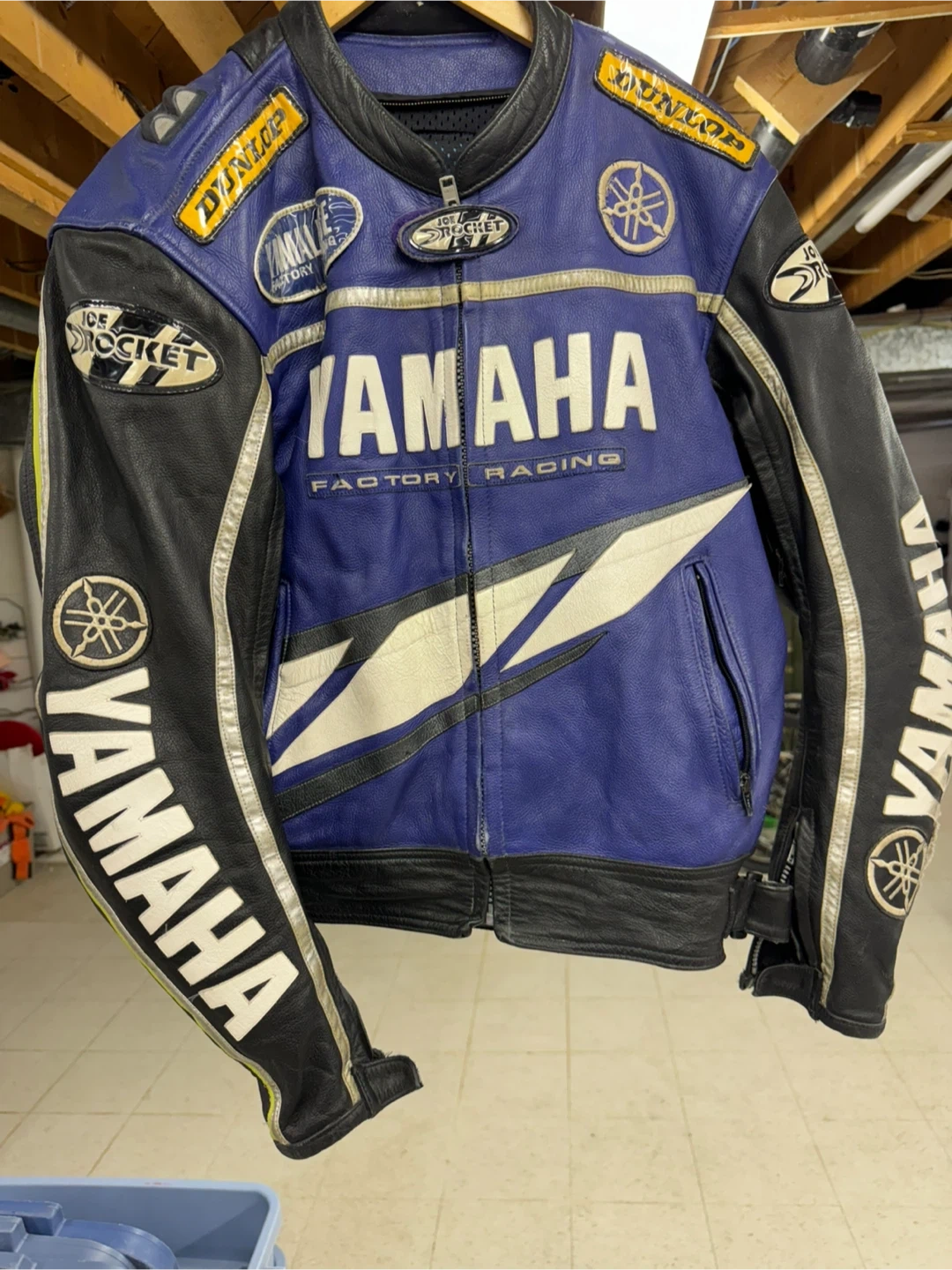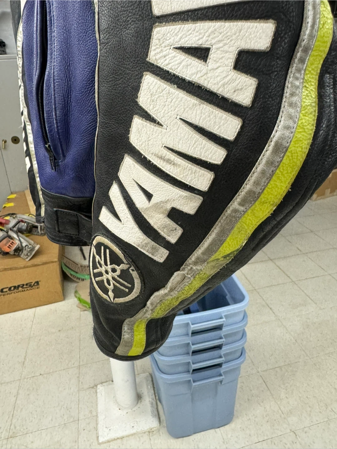 10Selling a Yamaha Factory Racing leather jacket. It has a blue, black, and white colour scheme with Yamaha logos throughout. There is some wear and tear, including a hole on one of the sleeves.