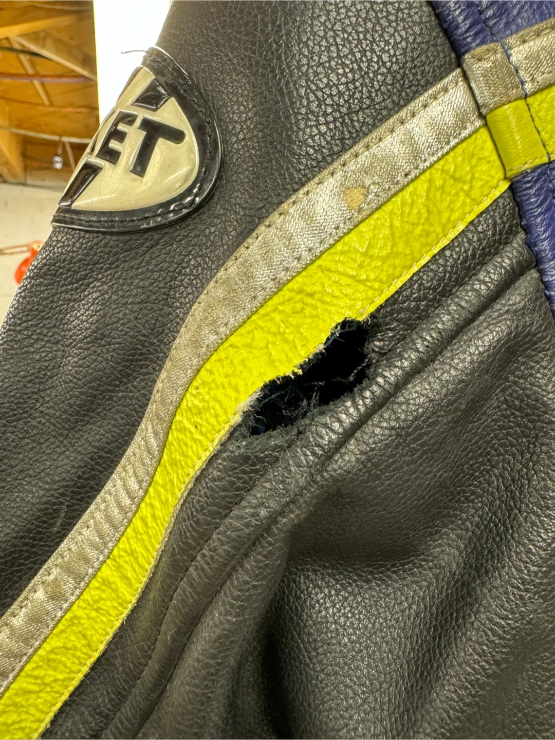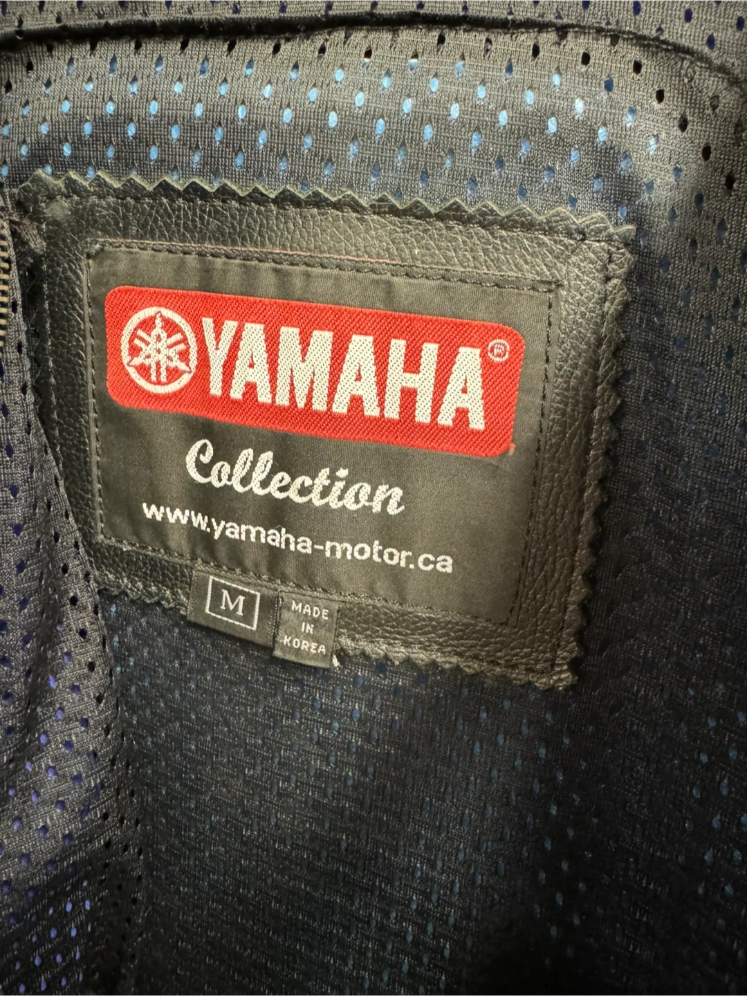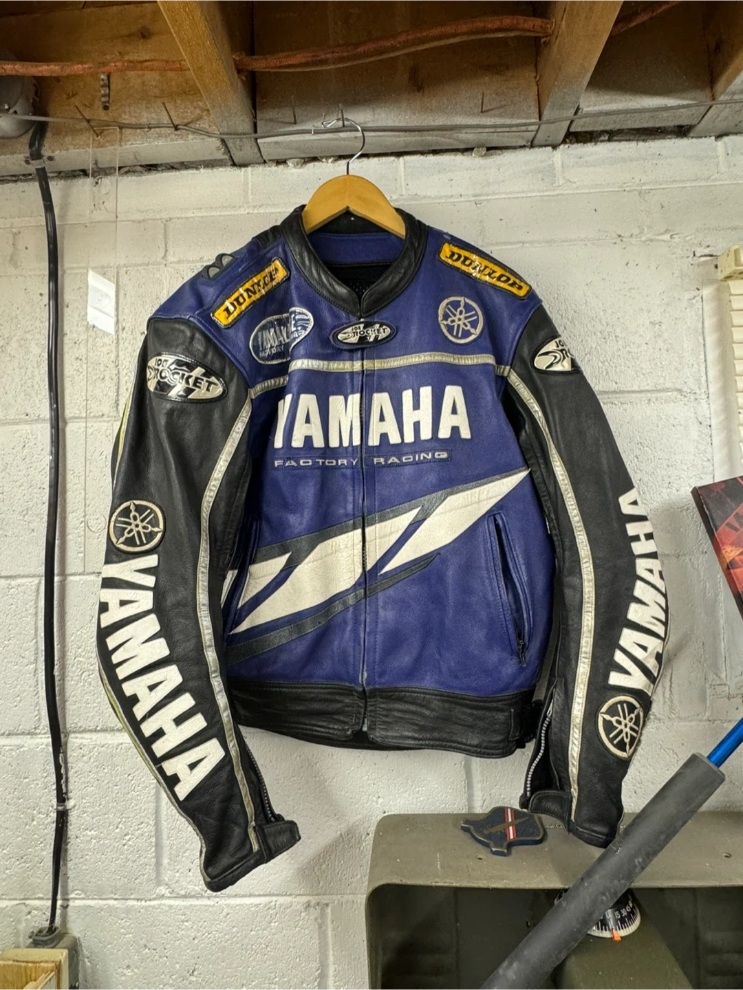 10Selling a Yamaha Factory Racing leather jacket. It has a blue, black, and white colour scheme with Yamaha logos throughout. There is some wear and tear, including a hole on one of the sleeves.