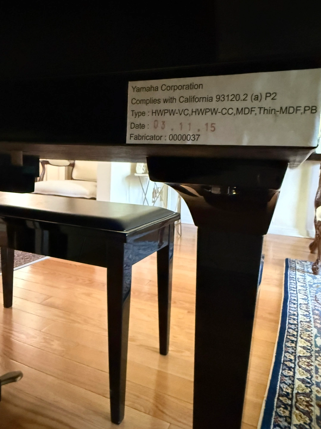 71Selling a beautiful Yamaha grand piano. It's in great condition and would be a wonderful addition to any home. Made in Indonesia. Complies with California 93120.2 (a) P2 Type : HWPW-VC, HWPW-CC, MDF, Thin-MDF, PB Fabrication Date: 2015 November 03