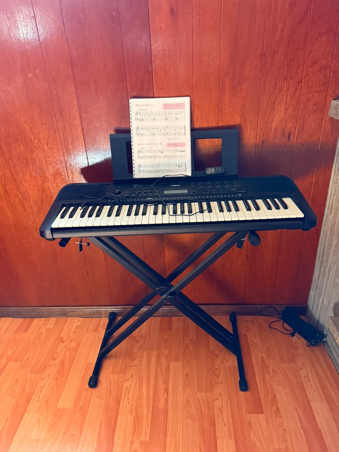 Selling a Yamaha keyboard! Perfect for anyone looking to learn or practice playing music. Comes with a stand and some sheet music to get you started. It's in great shape and ready for a new home! Yamaha PSRE-283 61 Key Portable Keyboard • 61 full-size keys • 400+ instrument voices & 100 accompaniment styles • Built-in songs & lesson features (perfect for beginners or practice) • Lightweight, easy to move • Comes with power adapter + stand