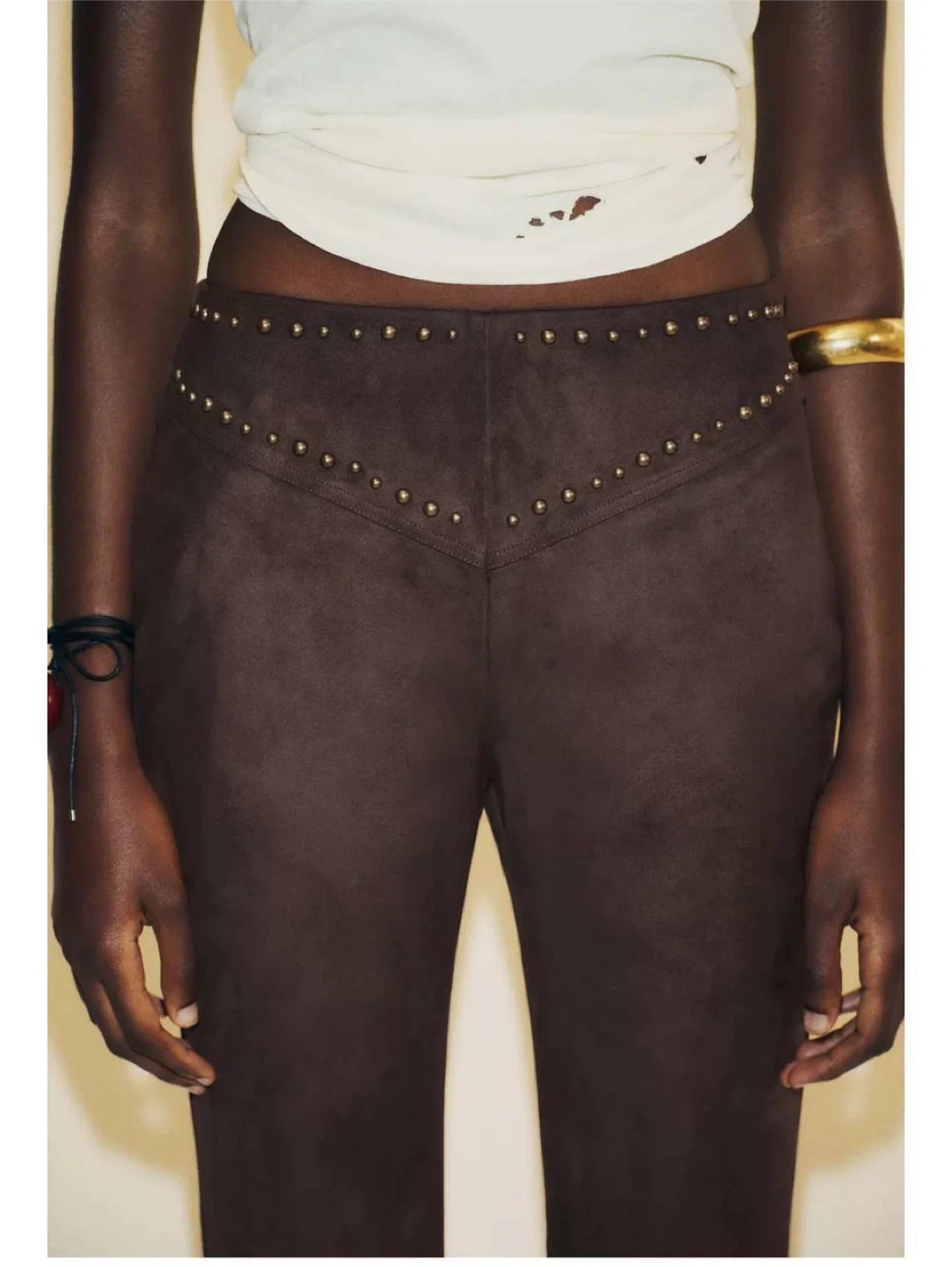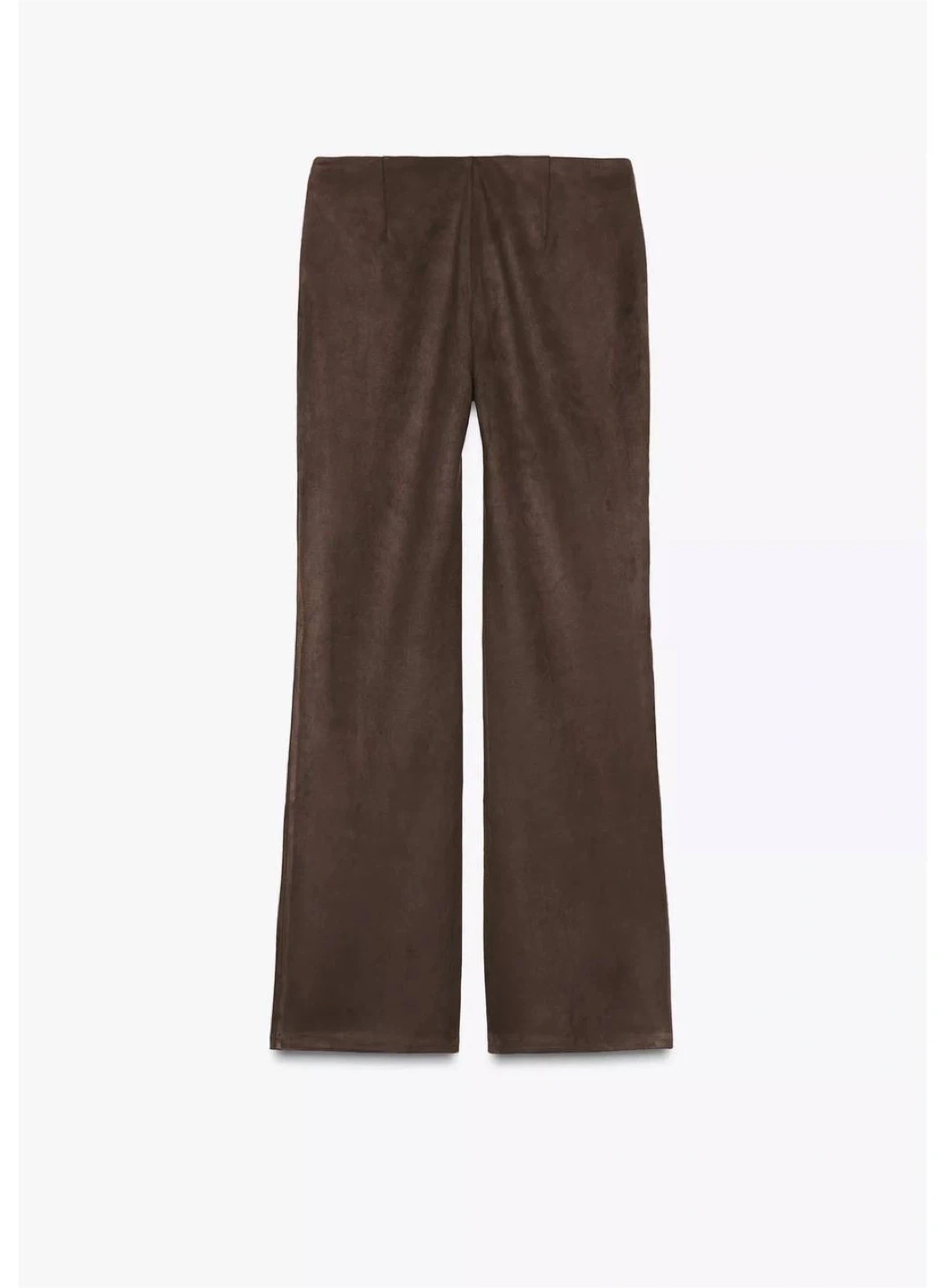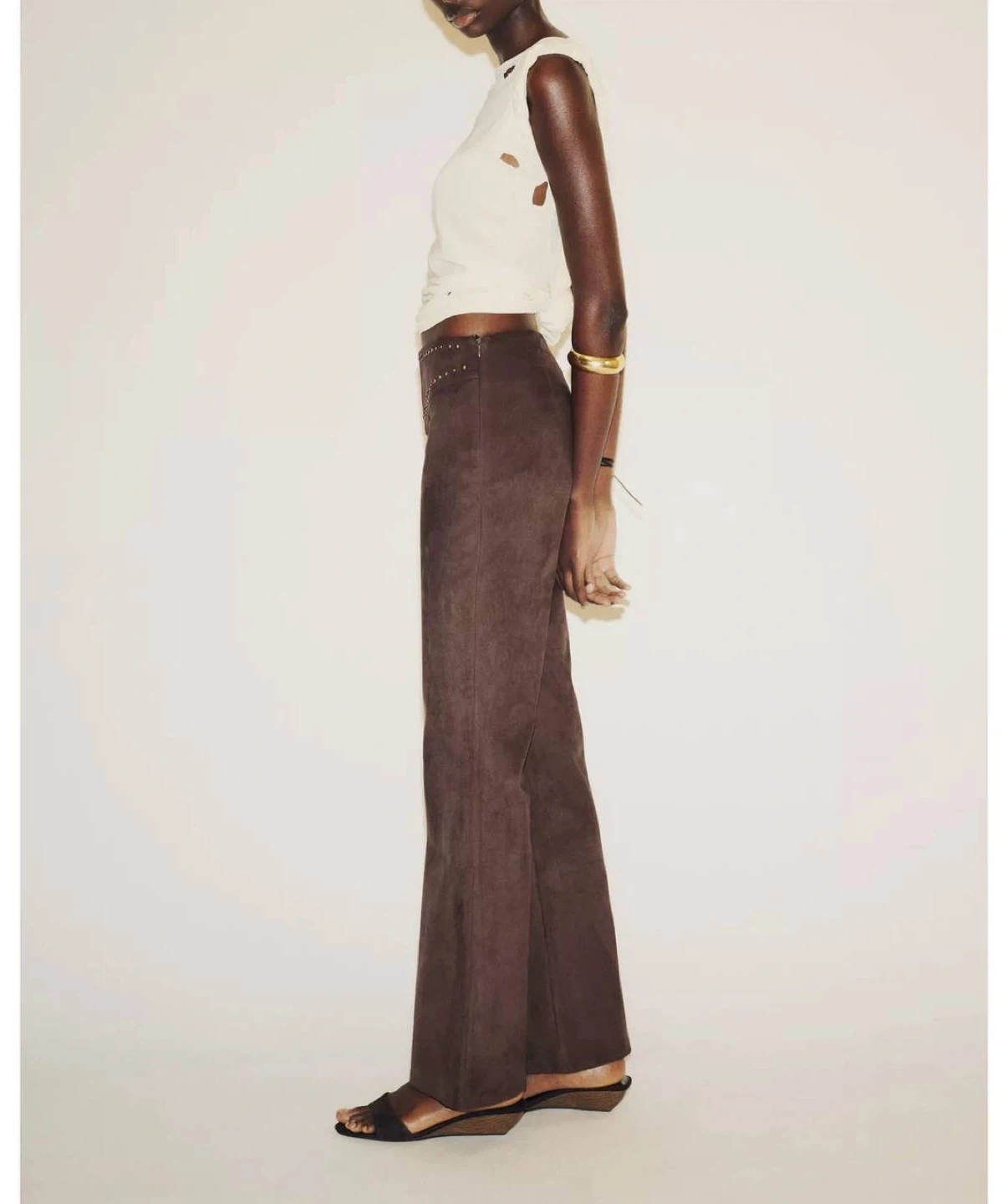 Stylish dark brown pants. Has cool studded details around the waist and a flared leg. Material is soft, feels like suede. Great for a boho or rock vibe.