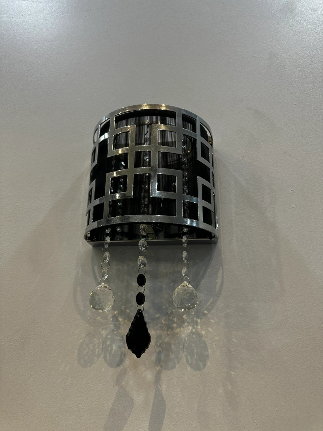Selling a stylish silver and black wall sconce! It features a unique geometric design and beautiful crystal accents. It would be a great addition to any room!