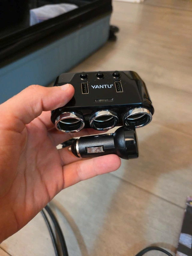 15Selling a Yantu car charger in used condition, featuring 3 cigarette lighter sockets and 2 USB ports for simultaneous charging of multiple devices. This handy adapter expands your car's charging capabilities, making it perfect for road trips or daily commutes. It has some cosmetic wear, but it functions perfectly. * 3 Cigarette Lighter Sockets * 2 USB Ports * Compact Design