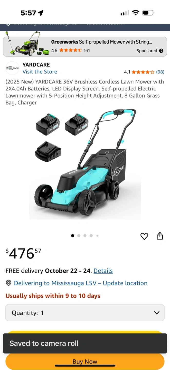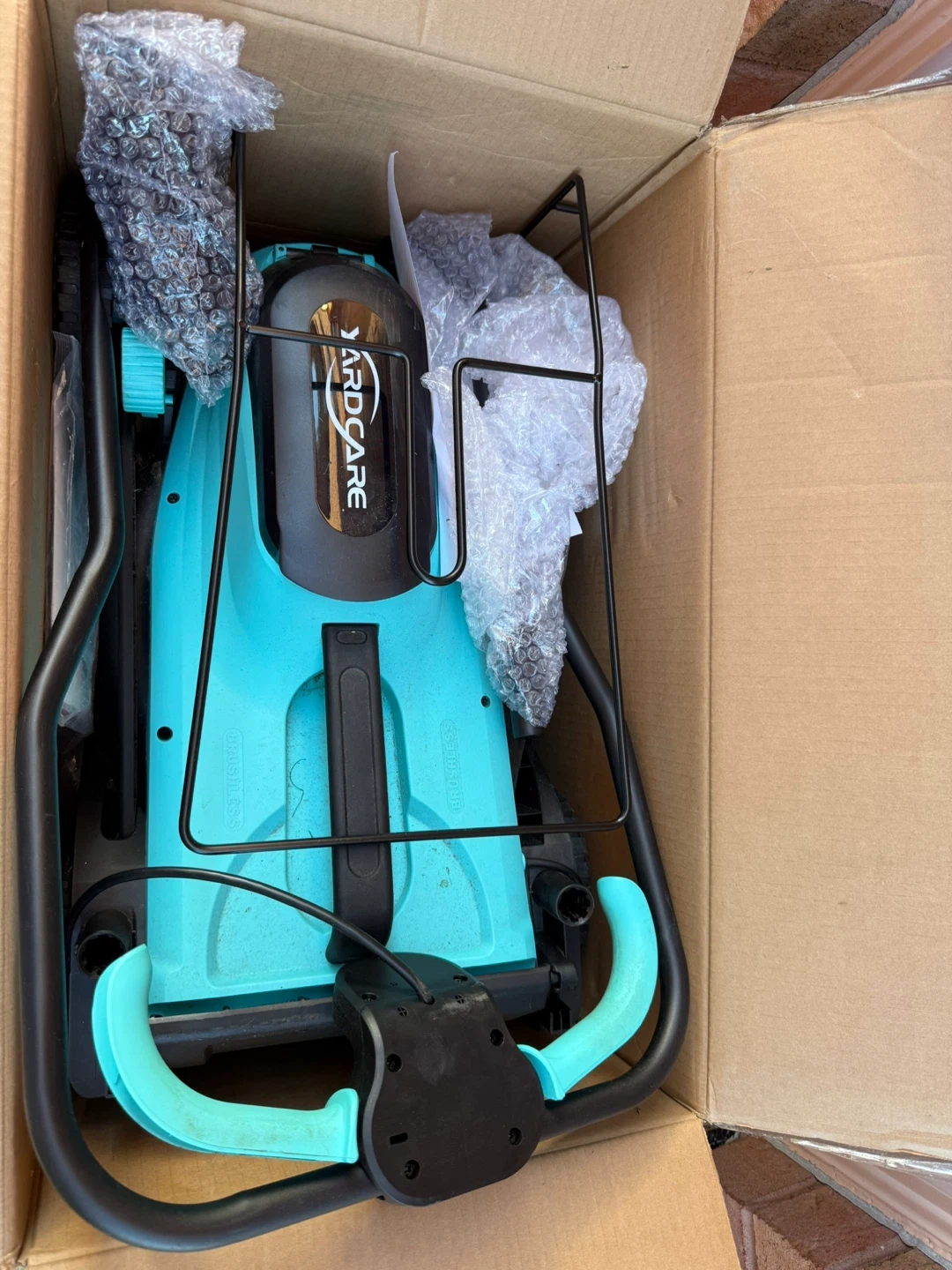 Selling a used like new YARDCARE Cordless Lawn Mower, model BLM40034. It's in excellent condition and comes with the original box. The mower is black and blue. It is a 36V Brushless Cordless Lawn Mower with 2x4.0Ah Batteries, LED Display Screen, Self-propelled Electric Lawnmower with 5-Position Height Adjustment, 8 Gallon Grass Bag, and Charger. Originally bought for $476.57