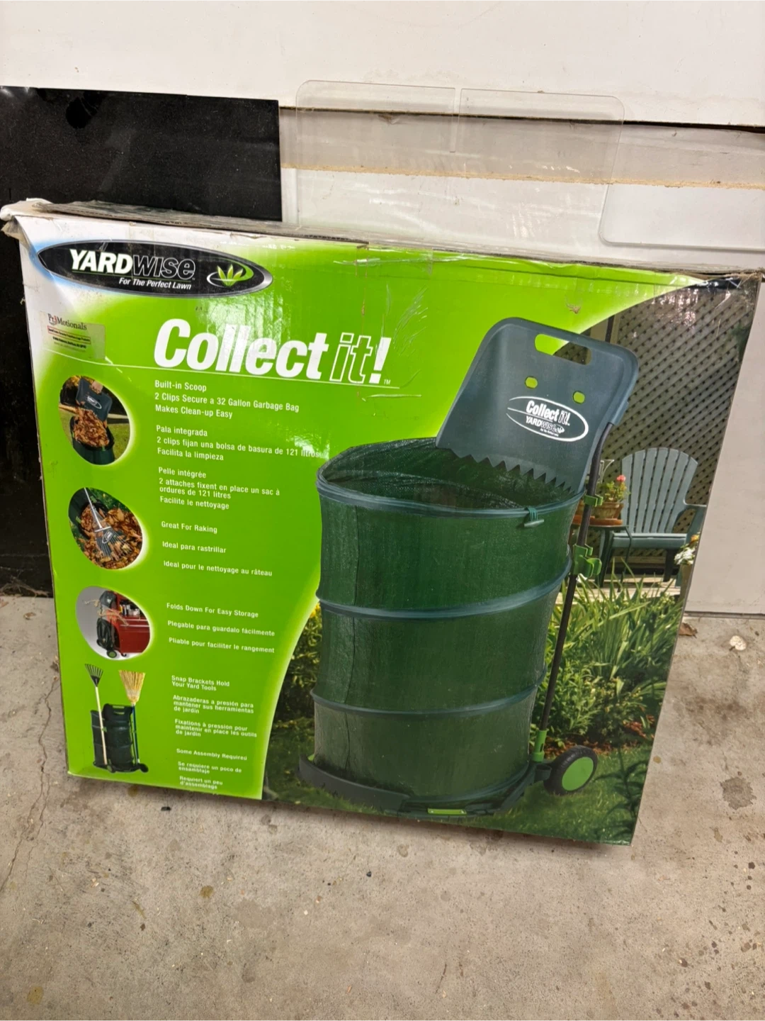 Selling a Yardwise Collect It! yard waste bin. It holds up to 32 gallons and makes yard clean-up easy. It features a built-in scoop and clips to secure a garbage bag. It also folds down for easy storage. Some assembly required. Still in box, never used.