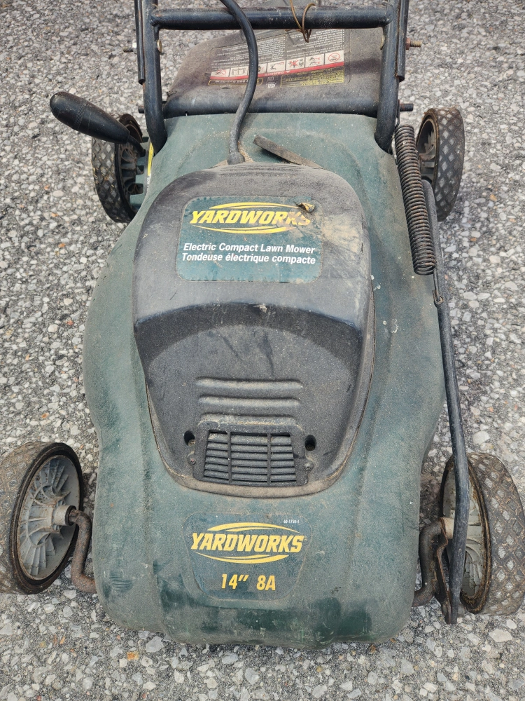 15Selling a Yardworks electric compact lawn mower. It has a 14" cutting width. It's in used condition but still works great!