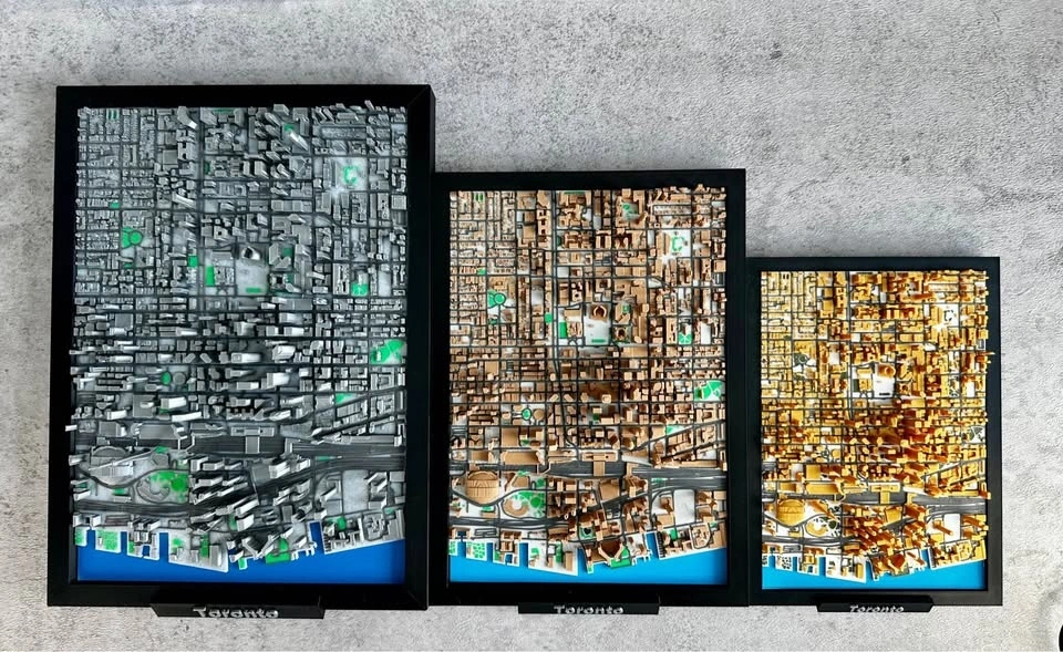 Detailed 3D printed map of Toronto. A unique piece for home or office decor, and a great gift for anyone who loves the city. Other sizes and colours available. 7 inches – $30, 9 inches – $40, 11 inches – $50. Material: High-quality 3D PLA (Bambu Lab). Pick-up: 30 Shore Breeze Drive, Toronto.