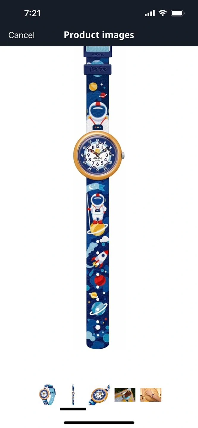 This New Flik Flak watch features a fun space and astronaut design on the strap. It's perfect for teaching kids how to tell time. The watch has a blue dial and an orange casing.