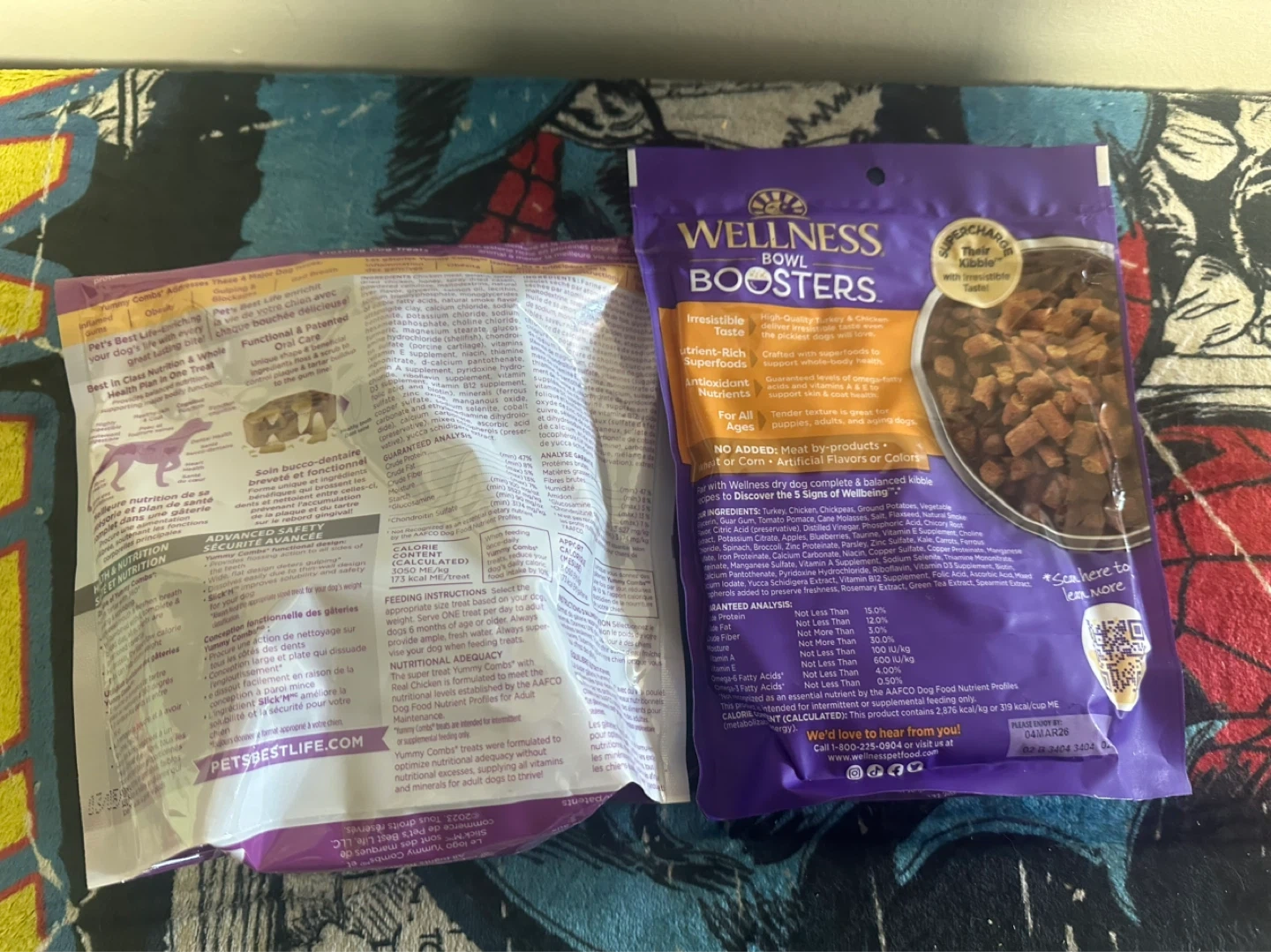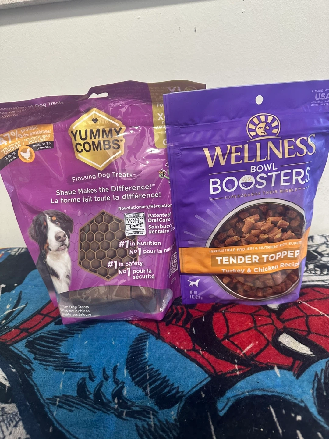 Two bags of dog treats for your furry friend. The Yummy Combs are flossing treats, and the Wellness Bowl Boosters are a tender topper in turkey and chicken recipe. These are great for supplementing your dog's regular kibble!