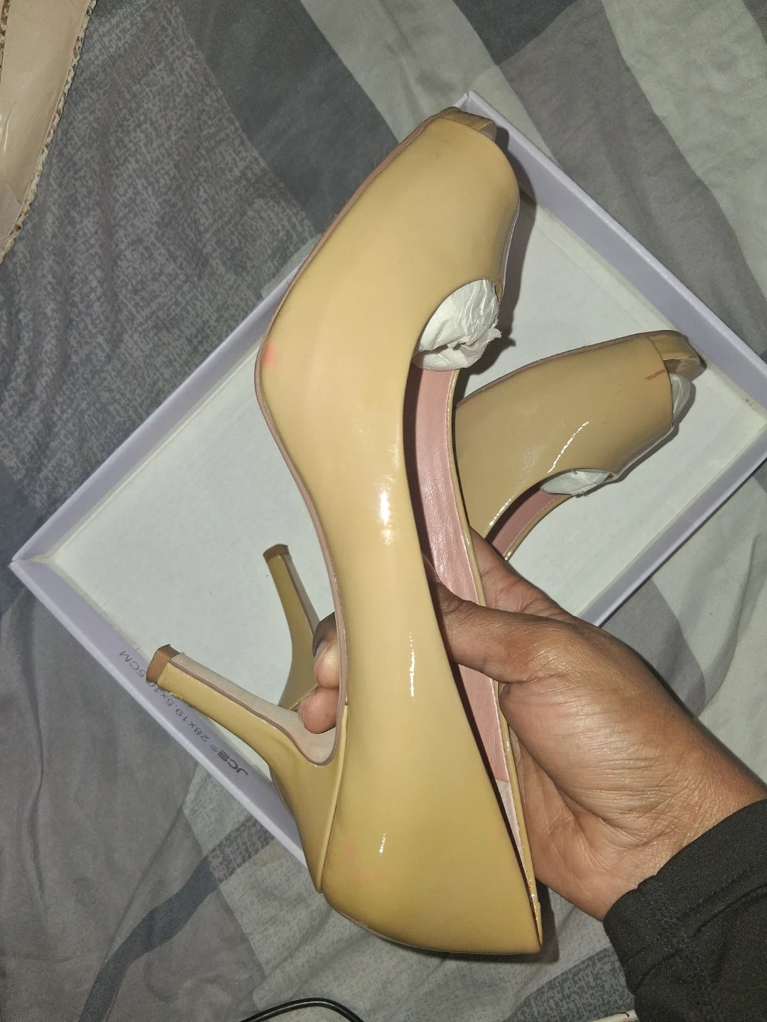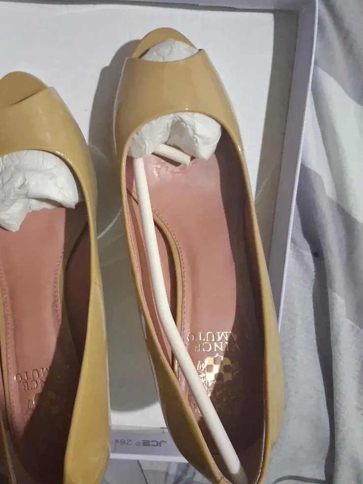 Vince Camuto patent leather peep-toe heels in a neutral beige shade. These heels feature a glossy finish and a classic pump silhouette.